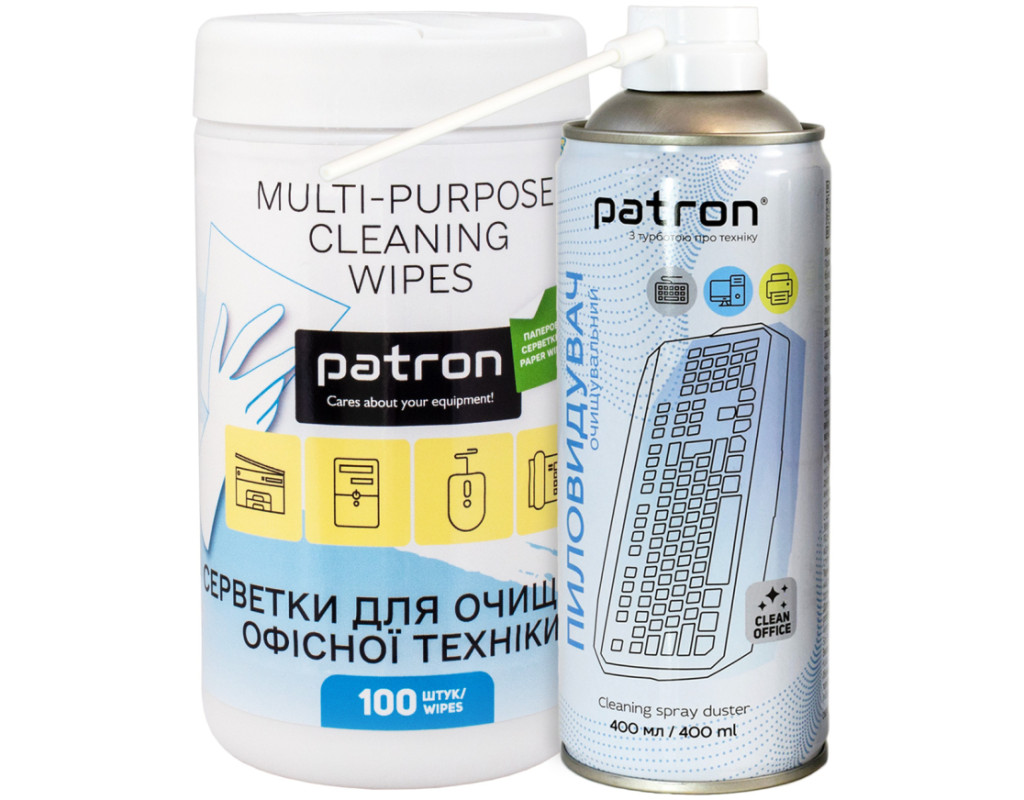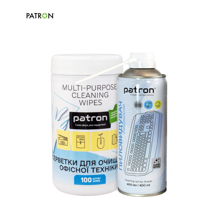 Набор 2в1: сжатый воздух 400 мл, Patron (F3-020) + салфетки для очистки оргтехники бумажные, туба 100 шт., Patron (F3-060). Сжатый воздух-спрей, 400 мл Patron (F3-020) предназначен для очистки клавиатур, ноутбуков, системных блоков, телевизоров, принтеров, копиров и другой офисной и бытовой техники. Специальная трубочка позволяет удалять пыль и грязь из труднодоступных мест. Имеет регулируемую интенсивность распыления. Является более бюджетной альтернативой компрессору. Также можно использовать в быту — для очистки плафонов ламп, жалюзи, бытовых приборов, удаления пыли из щелей. Средство не оставляет следов, не повреждает поверхность, не содержит озоноразрушающих веществ, безопасно для окружающей среды. Способ применения: