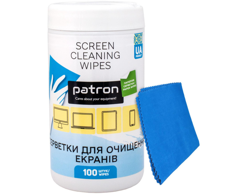 Комплект 2в1: салфетки для очистки экранов бумажные, туба 100 шт. Patron (F3-059) + салфетка микрофибра, 20 × 20 см (CS-PN-F4-019) Салфетки для очистки экранов бумажные, туба 100 шт. Patron (F3-059) Высококачественные влажные салфетки Patron предназначены для очистки TFT / LCD / LED и Plasma экранов, мониторов, дисплеев ноутбуков, смартфонов, стеклянных поверхностей. Салфетки оптимально пропитаны чистящим раствором, обеспечивают идеальную очистку без разводов и не требуют времени на высыхание. Эффективно удаляют пятна, отпечатки пальцев, пыль. Изготовлены из специальной бумаги, которая не оставляет ворсинок и мягко очищает поверхность. Перед применением ознакомьтесь с инструкцией по эксплуатации оборудования! Перед чисткой выключите устройство и дождитесь, пока экран остынет. Применение: вытяните салфетку через отверстие в крышке, протрите поверхность. После использования плотно закройте крышку тубы. Не содержат спирта и ароматизаторов, безвредны для кожи. В тубе — 100 салфеток, размер 12 × 13 см. Произведено в Украине. Салфетка микрофибра 20×20 см Patron (F4-019) Универсальная салфетка из микрофибры Patron — для использования с чистящими средствами или отдельно. Основные преимущества: