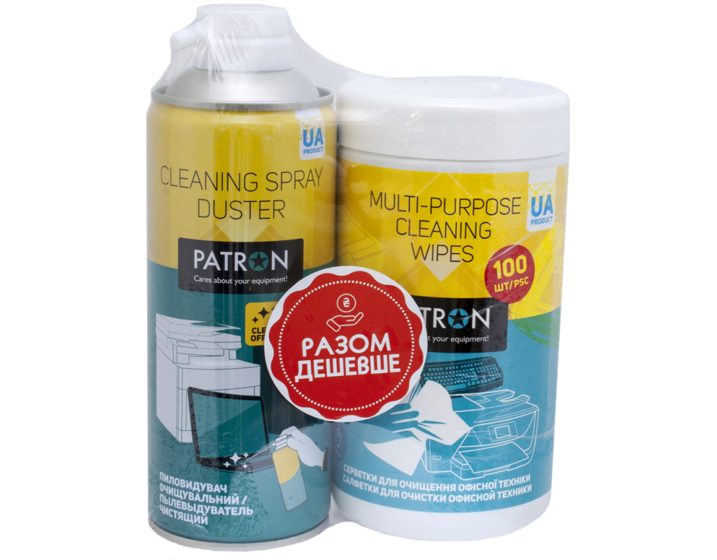 Набор 2в1: сжатый воздух 400 мл, Patron (F3-020) + салфетки для очистки оргтехники, туба 100 шт., Patron (F3-028). Сжатый воздух-спрей, 400 мл Patron (F3-020) предназначен для очистки клавиатур, ноутбуков, системных блоков, телевизоров, принтеров, копиров и другой офисной и бытовой техники. Специальная трубочка позволяет удалить пыль и грязь из труднодоступных мест. Имеет регулируемую интенсивность распыления. Является более бюджетной альтернативой компрессору. Можно использовать и в быту — для очистки плафонов ламп, жалюзи, бытовых приборов, удаления пыли из щелей. Средство не оставляет следов, не повреждает поверхности, не содержит озоноразрушающих веществ, безопасно для окружающей среды. Способ применения: