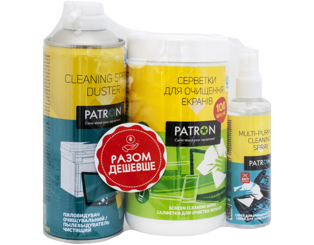 Очиститель оргтехники и пластика спрей, 100 мл Patron (F3-009) Спрей для очистки всех типов пластиковых и металлических поверхностей, офисного оборудования (кроме экранов). Спрей не оставляет разводов и не повреждает поверхность, оставляет защитный антистатический и антибактериальный слой. Перед применением ознакомьтесь с инструкцией по эксплуатации оборудования! Применение: перед очисткой выключите устройство и дайте ему остыть. Распылите небольшое количество жидкости на поверхность, которую необходимо очистить, и протрите её салфеткой. Рекомендуется использовать салфетку из микрофибры. Объем: 100 мл. Произведено в Украине. Салфетки для очистки экранов, туба 100 шт Patron (F3-027) Высококачественные влажные салфетки для очистки TFT / LCD / LED и Plasma экранов, мониторов, дисплеев ноутбуков, смартфонов, стеклянных поверхностей. Мягкие салфетки оптимально пропитаны очищающим раствором, обеспечивают идеальную очистку без разводов и не требуют времени на высыхание. Эффективно удаляют пятна, отпечатки пальцев, пыль. Перед применением ознакомьтесь с инструкцией по эксплуатации оборудования! Перед очисткой выключите устройство и дождитесь, пока экран остынет. Применение: вытяните центральную салфетку через отверстие в крышке. Протрите поверхность, которую необходимо очистить. После использования плотно закройте крышку тубы. Не содержат спирта и ароматизаторов, безопасны для кожи. В тубе 100 салфеток размером 13 × 14 см. Произведено в Украине. Сжатый воздух спрей, 400 мл Patron (F3-020) Предназначен для очистки клавиатур, ноутбуков, системных блоков, телевизоров, принтеров, копиров и другой офисной / бытовой техники. Специальная трубочка позволяет удалить пыль и грязь из труднодоступных мест. Имеет разную интенсивность распыления. Является более бюджетной альтернативой использованию компрессора. Также можно использовать в быту — для очистки плафонов ламп, жалюзи, бытовых приборов, удаления пыли из щелей. Средство не оставляет следов и не повреждает поверхность, не содержит озоноразрушающих веществ — безопасно для окружающей среды. Способ применения: