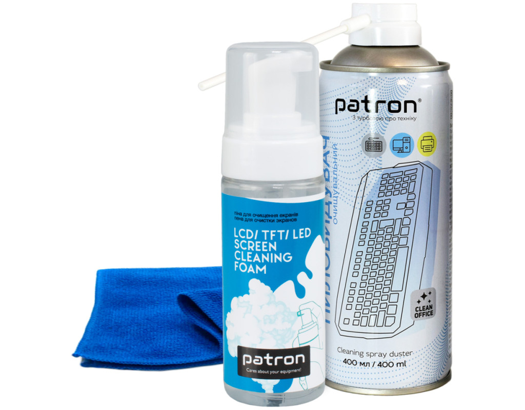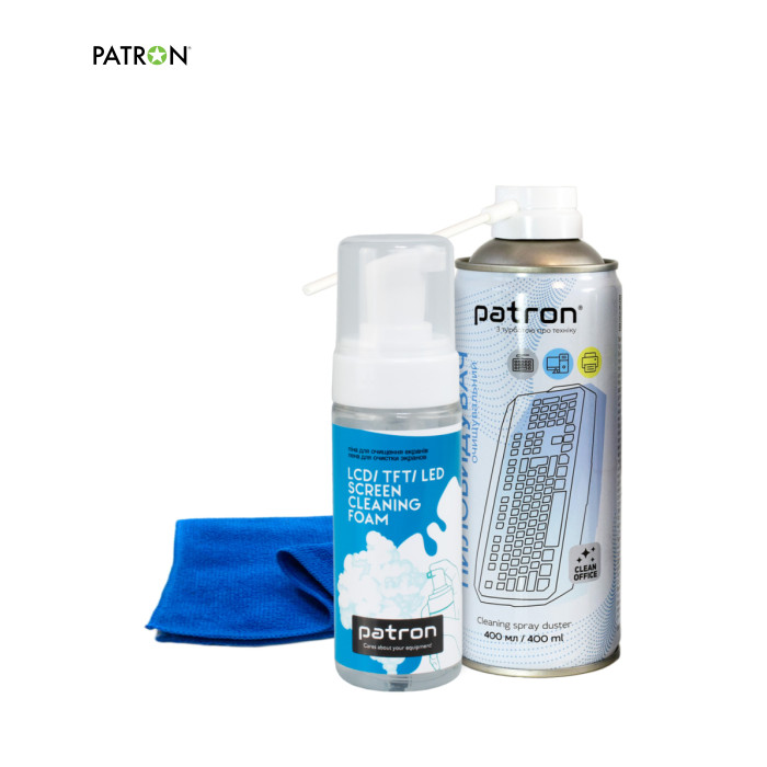 Комплект 3в1: сжатый воздух 400 мл (F3-020) + очиститель экранов пена, 150 мл (F3-029) + салфетка микрофибра 30х30 см (F4-009) Patron Рекомендации по очистке мониторов: