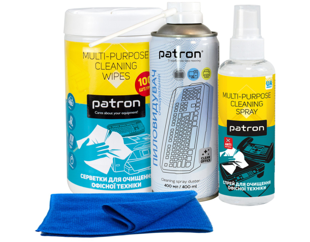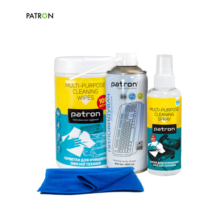 Набор 4в1: сжатый воздух 400 мл (F3-020) + салфетки для очистки оргтехники, туба 100 шт (F3-028) + очиститель оргтехники спрей, 250 мл (F3-002) + салфетка микрофибра 30х30 см (F4-009) Patron Сжатый воздух спрей, 400 мл Patron (F3-020) Предназначен для очистки клавиатур, ноутбуков, системных блоков, телевизоров, принтеров, копиров и другой офисной / бытовой техники. Специальная трубочка позволяет удалить пыль и грязь из труднодоступных мест. Имеет разную интенсивность распыления. Является более бюджетной альтернативой использованию компрессора. Можно также использовать в быту — для очистки плафонов ламп, жалюзи, бытовых приборов, удаления пыли из щелей. Средство не оставляет следов и не повреждает поверхность, не содержит озоноразрушающих веществ — безопасно для окружающей среды. Способ применения:
