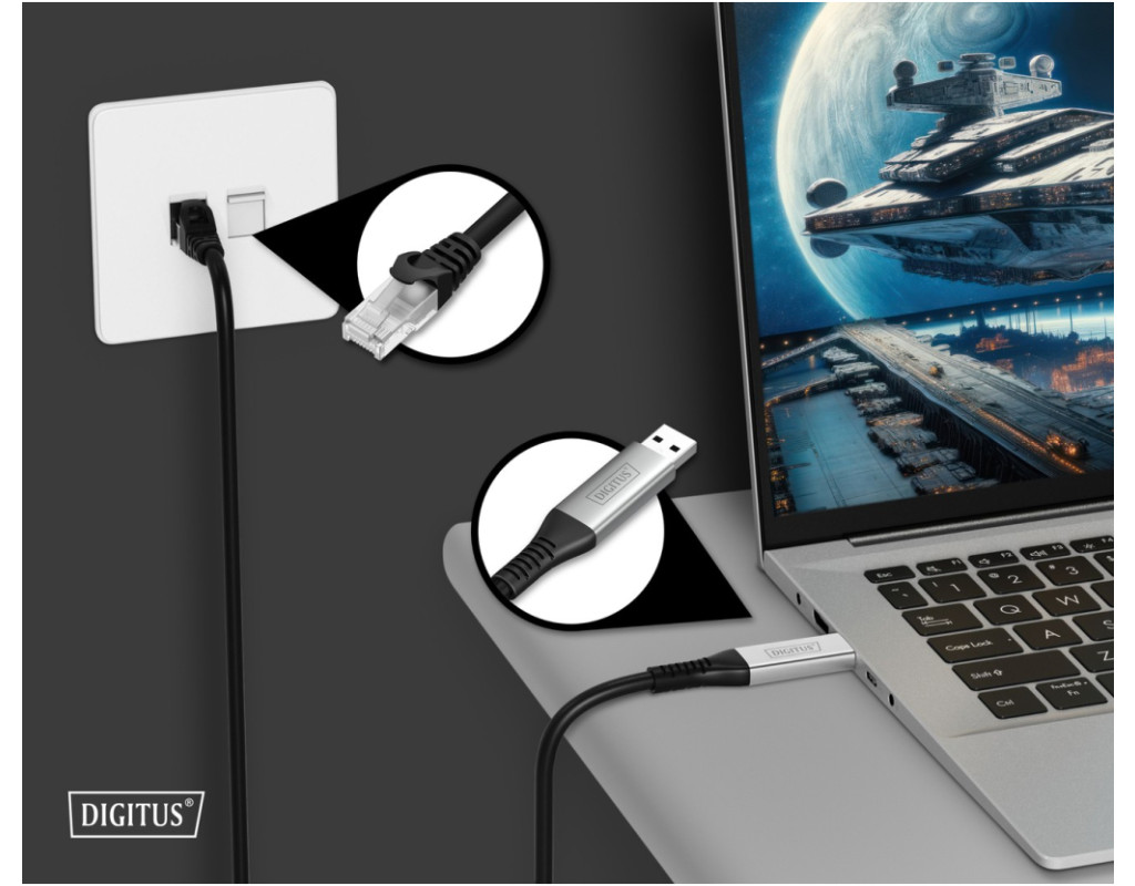 | Кабель Digitus USB-A – RJ45 Ethernet позволяет легко подключить устройства с портом USB-A к проводной сети, обеспечивая стабильное гигабитное соединение без необходимости адаптеров. Идеально подходит для ноутбуков, ПК и других устройств без порта Ethernet. Поддержка Wake-On-LAN и Wake-On-WAN позволяет дистанционно активировать устройство. Безопасный LSZH-корпус минимизирует дым и токсичные испарения при пожаре. Plug-and-play, совместимый с macOS и Windows – без драйверов и внешнего питания. Длина кабеля - 2 м. CAT 6A S/FTP. |