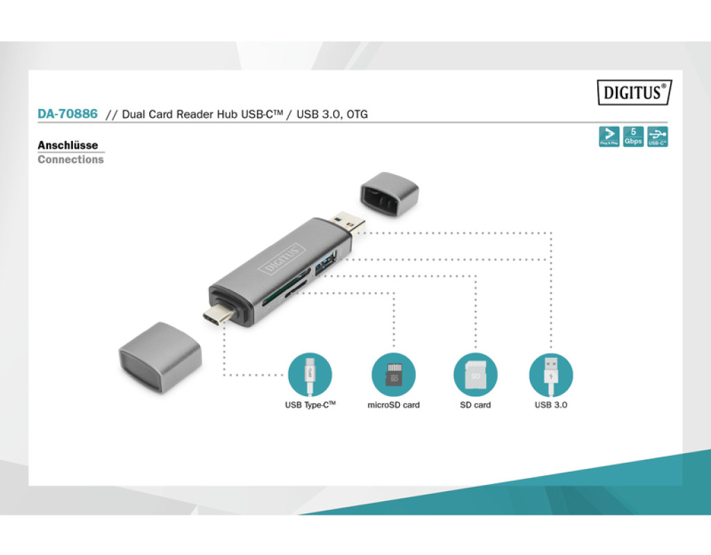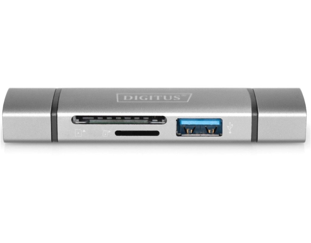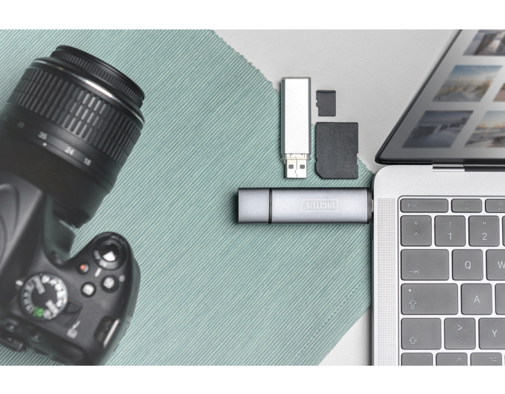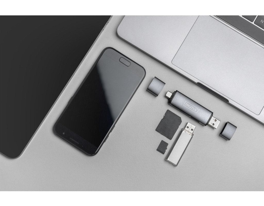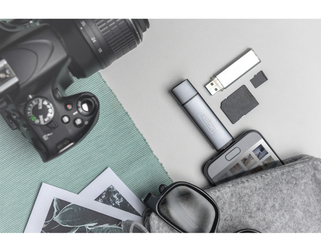 | Простое подключение карт памяти и USB-накопителя к смартфону или планшету – USB-C и USB A. Двойной кардридер DIGITUS® со встроенным USB-концентратором (OTG) можно подключить к смартфону, планшету или ноутбуку. Это позволяет получить доступ к вставленным носителям информации, таким как флешки, карты памяти SD или MicroSD. |