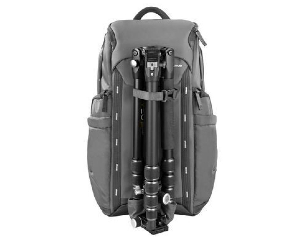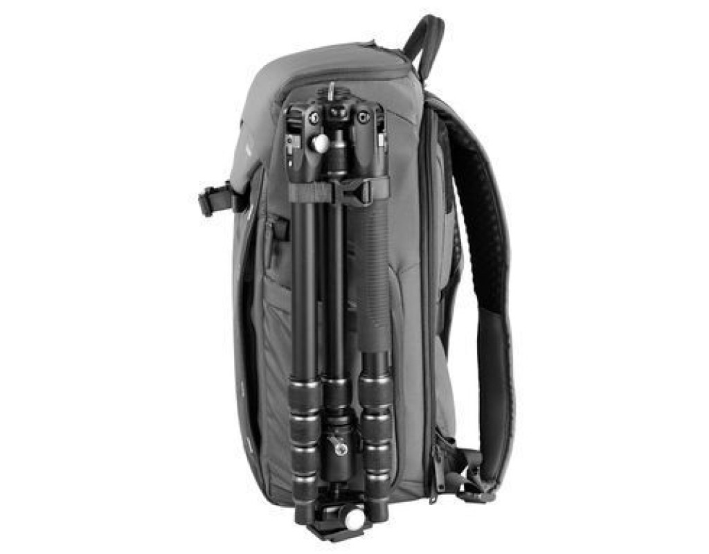 - Боковые карманы на эластичной стяжке и ремешок на верхней петле позволяют зафиксировать небольшой полноразмерный штатив с каждой стороны рюкзака;