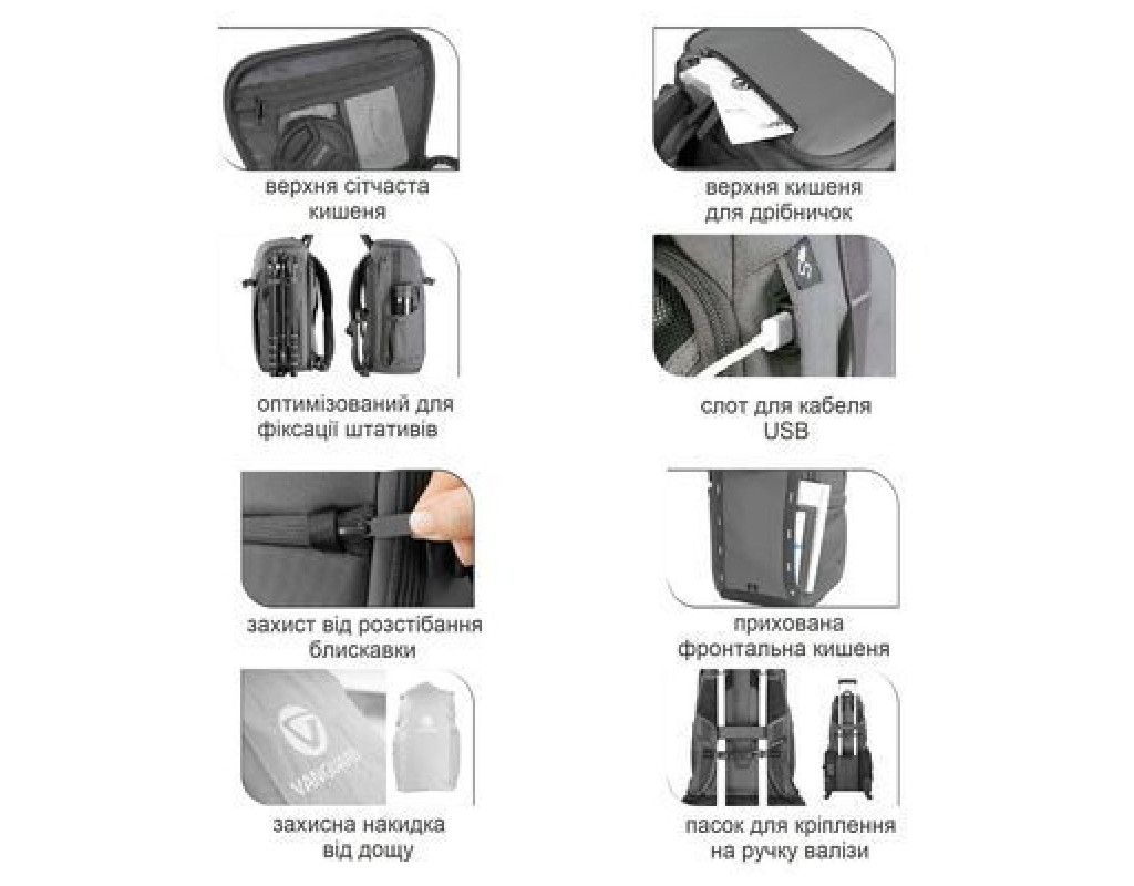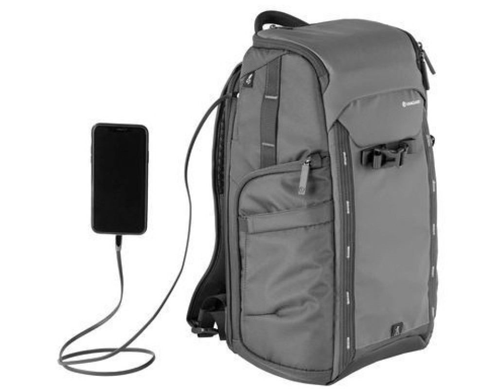 Классические рюкзаки для фотокамеры VEO Adapter имеют солидный внешний вид, выполнены из прочных водозащищенных материалов, имеют невероятно широкий функционал и позволяют комфортно заниматься фотографией в городе или активно путешествовать с камерой даже в сложных погодных условиях. Это первые рюкзаки Vanguard, имеющие внешний USB-выход. Рюкзак Vanguard VEO Adaptor R48 продуман до мелочей, что делает его мультифункциональным и поднимает комфорт использования на новый уровень. Скрытый в спинке рюкзака вход в основное отделение делает доступ к камере и всем аксессуарам быстрым и удобным. Рюкзак имеет нагрудный ремень и набедренный пояс, позволяющие разгрузить плечи во время активного передвижения с загруженным рюкзаком. Когда в ремне и поясе нет необходимости – они могут быть сняты, или сложены в специальные скрытые карманчики. Скрытая текстильная пятка, съемный ремешок на фастексе, боковые карманы и система петель позволяют зафиксировать полноразмерный штатив в трех разных положениях снаружи рюкзака. Мягкий внутренний карман вмещает ноутбук с диагональю до 16". - Объем: 20 л