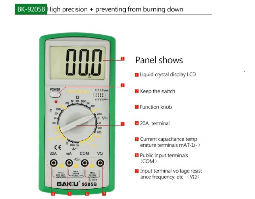 | Цифровой Мультиметр BAKKU BK-9205B - надежный помощник в доме, гараже, на даче. С его помощью вы сможете измерить много различных параметров. Отремонтировать бытовую технику, электронику автомобиля и мотоцикла, проверить проводку на даче? Со всеми этими задачами поможет справиться мультиметр! Пример эксплуатации устройства: Необходимо установить щупы в гнездо и выставить круговой переключатель в необходимы для вас режим, таким образом производится замер. Через пару секунд значения отобразятся на дисплее. Несколько простых действий и все готово. Особенности: