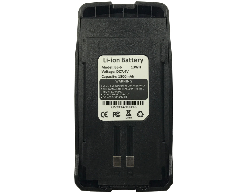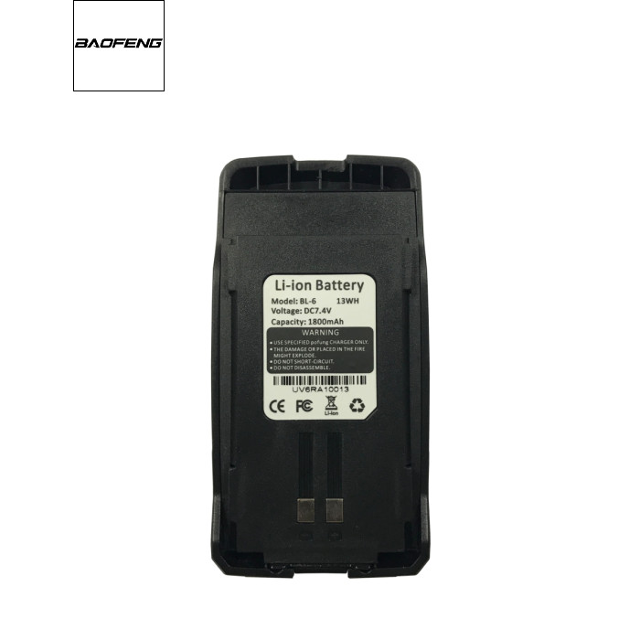 UV-6R. Рации часто используются вдали от городских коммуникаций и электричества, для того чтобы рация не разрядилась в наиболее неподходящий момент стоит заранее позаботиться о дополнительном питании рации. Мощная аккумуляторная батарея Baofeng будет оптимальным решением данной проблемы, она изготовлена по современной технологии Li-ion, и выдерживает 1000 циклов заряда/разряда без существенной потери емкости.