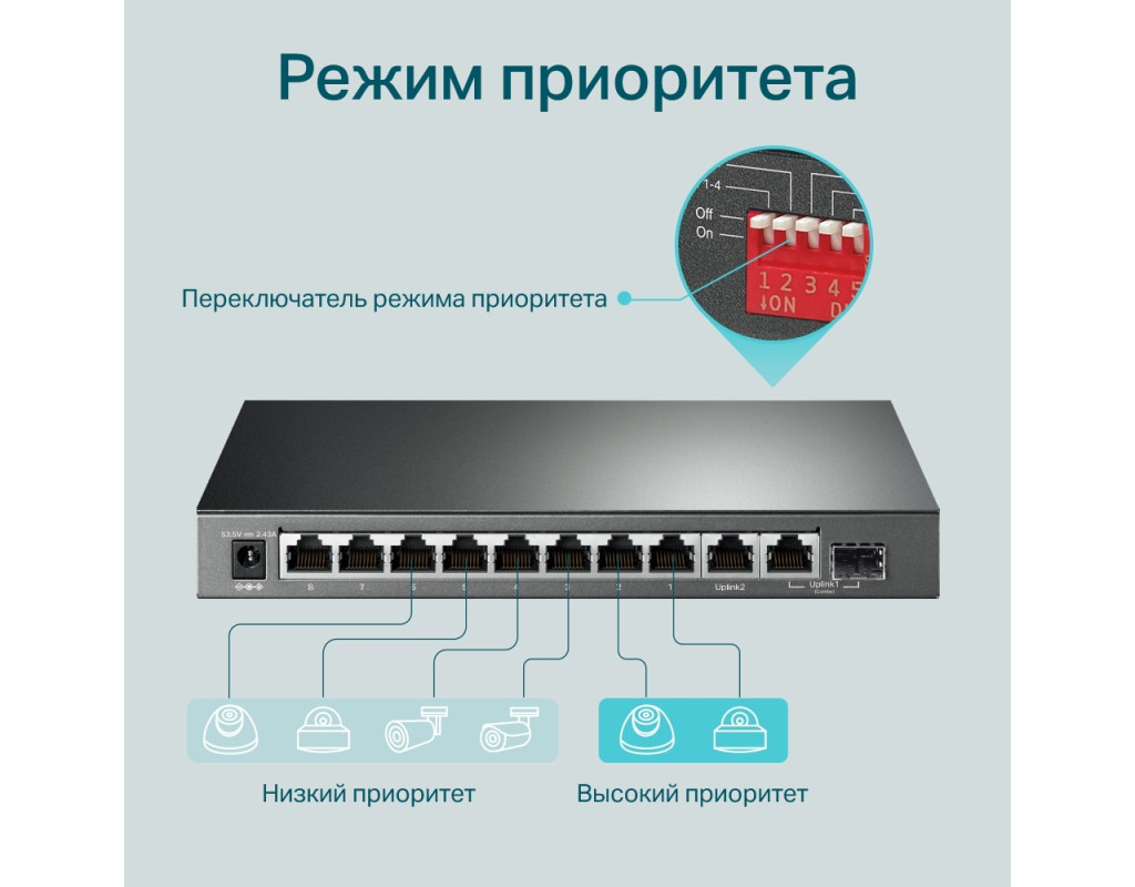 Благодаря соответствию стандарту PoE+ 802.3af/at каждый порт PoE поддерживает до 30 Вт, а общий бюджет PoE 123 Вт* для 8 портов PoE+ открывает широкий ряд возможностей, например, создание видеонаблюдения для офисов, общежитий и малого бизнеса. TL?SG1210MP полностью совместим с IP?камерами, точками доступа, IP?телефонами, компьютерами, принтерами и не только. |