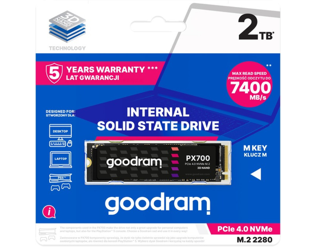 Полностью используя возможности самого популярного поколения твердотельных накопителей, можно добиться скорости чтения до 7400 МБ/с и записи до 6500 МБ/с. До недавнего времени подобные показатели были присущи только самым дорогим решениям, доступным на рынке. Высшая скорость, более долгий срок службы – откройте для себя больше! Goodram PX700 использует технологию HMB 3.0 для управления памятью, известную как буфер хоста, которая позволяет эффективно распределять отдельные биты памяти, используя оперативную память компьютера. HMB 3.0 гарантирует стабильную и молниеносную скорость чтения и записи данных, что приводит к более быстрому запуску приложений и молниеносной загрузке игр и файлов. Благодаря буферу памяти хоста данные доступны в любое время без задержек, что очень важно при использовании требовательных приложений и современного программного обеспечения. Кроме того, Goodram PX700 способен оптимизированно управлять питанием, что приводит к снижению энергопотребления, что, в свою очередь, продлевает время работы ноутбука, что имеет большое значение для мобильных пользователей. Безопасность данных Высокий уровень TBW (общее количество записанных байтов) до 2400 ТБ является очень важным показателем диска SSD Goodram PX700 . TBW – это показатель долговечности и срока службы накопителя, указывающий на общий объем данных, которые можно записать на SSD в течение всего гарантийного срока до того, как накопитель достигнет своих теоретических пределов. Чем выше показатель TBW, тем более долговечен носитель и тем меньше он подвержен сбоям из-за интенсивной записи и считывания данных. Показатель TBW особенно важен в профессиональных приложениях и, при необходимости, интенсивной записи файлов большого размера. Забудьте об ограничениях и повысите удобство работы Накопитель Goodram PX700 – флагман последнего поколения накопителей, отличающийся непревзойденной производительностью и универсальной совместимостью. Благодаря универсальному формату диск PX700 идеально подходит для различных приложений, где скорость, производительность и пропускная способность имеют решающее значение. PX700 – идеальное решение для настольных компьютеров, рабочих станций и ноутбуков, особенно используемых для работы с графикой, редактирования видео и современных развлечений. Он обеспечивает очень высокую скорость передачи данных, сокращает время загрузки игр и приложений и повышает общую производительность ПК. Широкая совместимость Кроме того, накопитель PX700отвечает самым строгим требованиям к расширению памяти консолей PlayStation, поставляемых с ограниченным объемом памяти на заводе. Это ограничение затрудняет хранение большего количества игр и влияет на удобство использования консоли. Использование диска SSD PX700 значительно улучшает качество и производительность игрового процесса, одновременно расширяя возможности консоли. Температура под контролем SSD диска Goodram PX700 оснащен низкопрофильным радиатором, изготовленным из графена. Этот материал является одним из лучших теплопроводников. Графеновый радиатор отлично рассеивает тепло, выделяемое компонентами диска SSD, помогая поддерживать подходящую температуру диска. Обеспечение оптимальных температур является ключевым фактором, поскольку низкие температуры влияют на стабильность работы накопителя PX700 и увеличивают срок сл