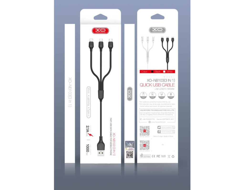 USB Кабель XO NB103 3in1 имеет сразу три разъема для подключения – Lightning/MicroUSB/Type-C, это очень удобно при наличии нескольких устройств с разными разъемами. Кабель имеет длину 1 метр. Максимальная мощность 5V/3.5A (MicroUSB-Lightning) и 10V/4A (Type-C). Характеристики: