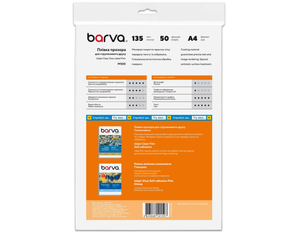 Пленка для печати BARVA A4 (IF-M100-040) идеально подходит для внутренних и внешних оформительских работ. Благодаря своей долговечности и стойкости к выцветанию эта пленка – прекрасный выбор для цветной печати самоклеящихся плакатов, указателей, вывесок и другой подобной продукции. Пленка для печати подходит для печати изображений с разрешающей способностью до 5760+ dpi. Пленка выдерживает температурные колебания от 10 до +30°С. Материал основы обеспечивает четкую передачу текста и изображений, быстрое высыхание. |
