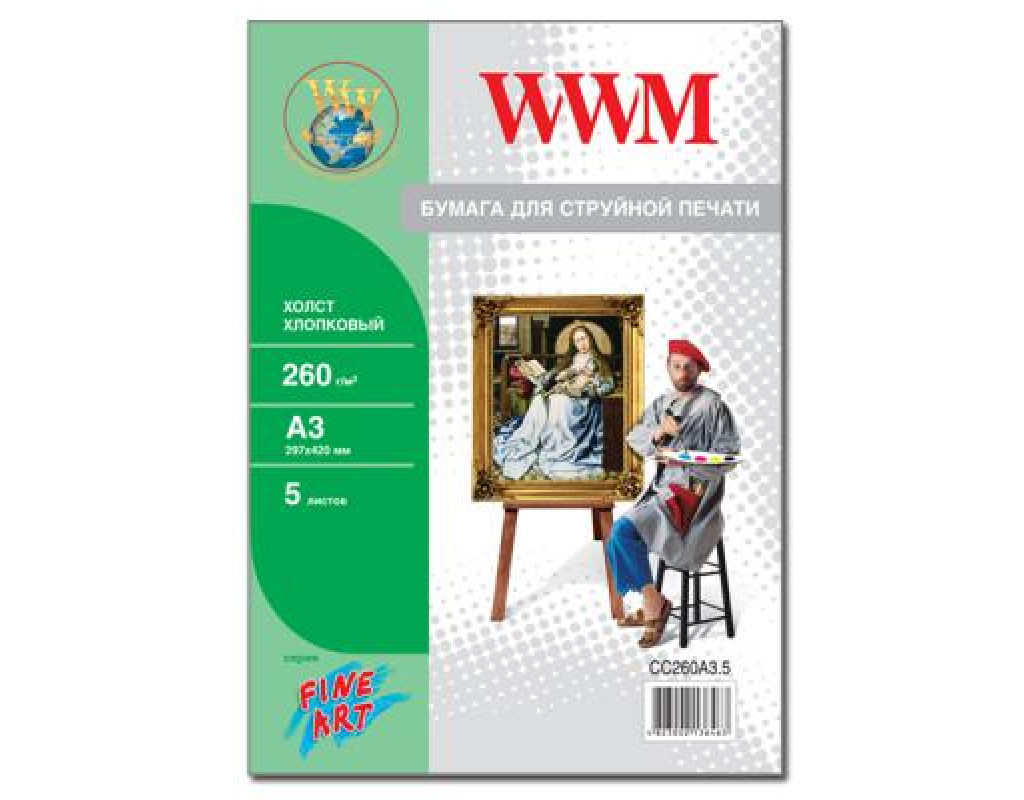 Бумага WWM A3 Fine Art (CC260A3.5)- это плотный носитель из натурального хлопка (100%) с ярко-белой бархатистой поверхностью. Пригоден для печати изображений с разрешением до 1440 dpi. Быстро сохнет. Идеален для печати художественных работ и репродукций. Для получения наилучших результатов печати выбирайте соответствующий тип носителя в установках принтера.