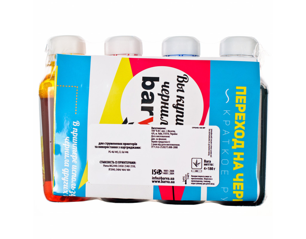 Чернила BARVA CANON PG-445BL + CL-446 C/M/Y 4х180г (CPG445-180-MP) Чернила Особенности модели: улучшенная устойчивость цвета; качество цветопередачи и самого процесса печати; чистота ваших рук, благодаря удобному флакону; продукт, цена которого вас приятно удивит, произведен в Украине; совместимы не только с оригиналом, но и с чернилами других производителей. |