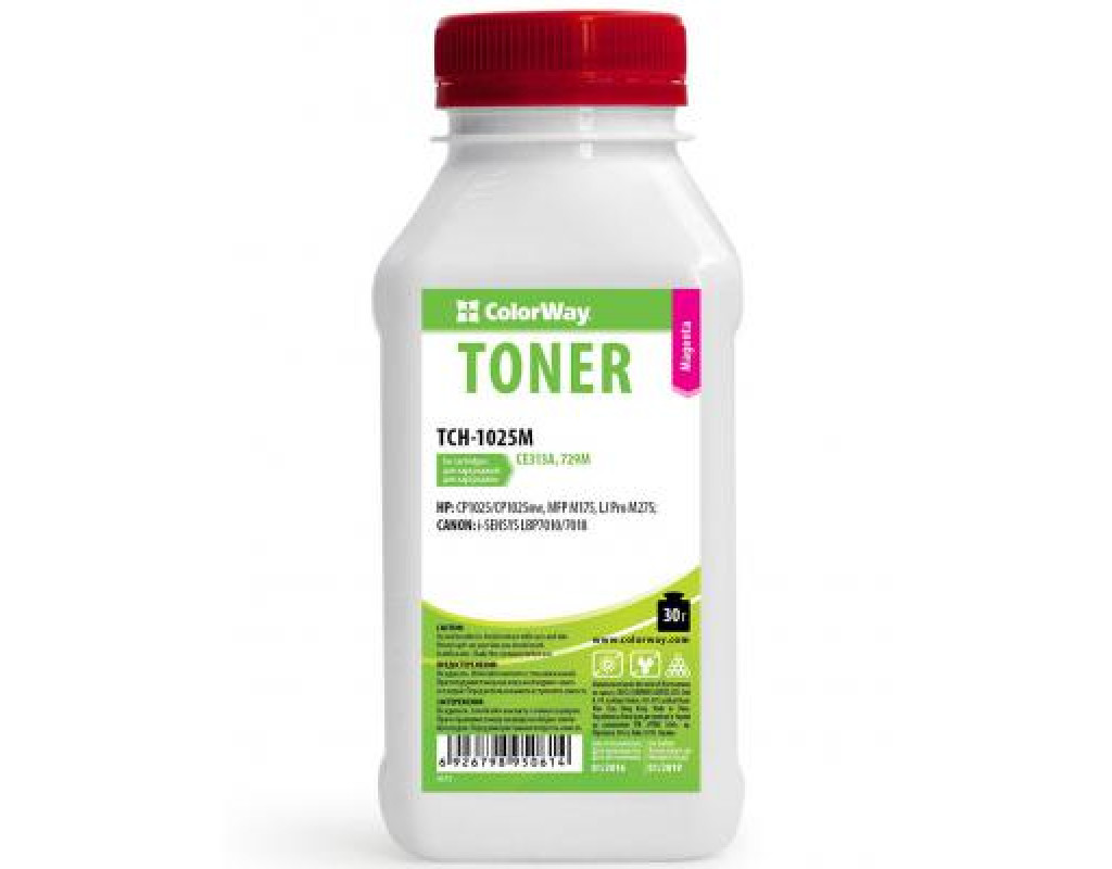 Если Вы используете в работе принтер или копировальный аппарат, значит, сталкиваетесь с вопросом замены тонера или чернил. HP CLJ CP1025/Pro100/M175 Magenta 30g ColorWay (TCH-1025M) - высококачественный тонер для лазерных принтеров. Данный тонер отличается не только высоким качеством, благодаря усовершенствованной технологии производства, но и удобной упаковкой и особенным дизайном. При этом фасовка осуществляется таким образом, чтобы обеспечить удобное и простое использование.