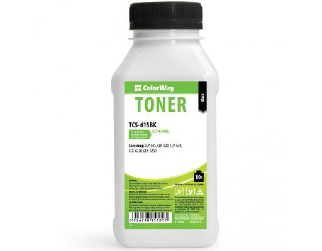 Если Вы используете в работе принтер или копировальный аппарат, значит, сталкиваетесь с вопросом замены тонера или чернил. SAMSUNG CLP-615/620ND/670ND Black 80g ColorWay (TCS-615BK) - высококачественный тонер для лазерных принтеров. Данный тонер отличается не только высоким качеством, благодаря усовершенствованной технологии производства, но и удобной упаковкой и особенным дизайном. При этом фасовка осуществляется таким образом, чтобы обеспечить удобное и простое использование.