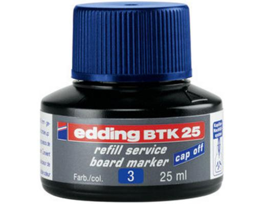 Краска Edding для Board e-BTK25 blue (BTK25/03) Чернила для бордмаркеров edding-BTK 25 обладают свойством cap-off, с помощью данных чернил cap-off, маркер может оставаться открытым без колпачка некоторое время и качество не пострадает. Пигментные чернила