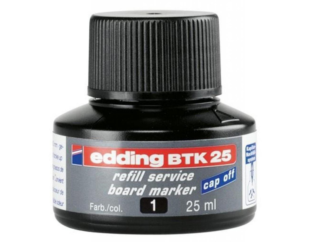Чернила для бордмаркеров edding-BTK 25 обладают свойством cap-off, с помощью данных чернил cap-off, маркер может оставаться открытым без колпачка некоторое время и качество не пострадает. Пигментные чернила Edding для Board e-BTK25 изготавливаются на водной основе и, в отличие от перманентных чернил менее токсичны и не горючие. Краска Edding для Board e-BTK25 black не протекают через бумагу, поэтому широко используются для маркировки бумажной упаковки, почтовых отправлений, бумаги в рулонах и т.д. Просто установить маркер наконечником в заправку, и через час маркер готов снова писать. Емкость - 25 мл. Цвет краски–черный. |