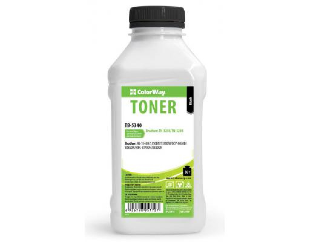 Тонер ColorWay Brother HL-5340D/5350DN/5370DW/DCP-8070D/8085DN/MFC-8370DN (TB-5340) Тонер отличается не только высоким качеством, благодаря усовершенствованной технологии производства, но и удобной упаковкой и особенным дизайном. Тонер изготовлен из высококачественных компонентов на основе уникальной формулы, что гарантирует превосходную совместимость тонера в оригинальных расходных материалов.