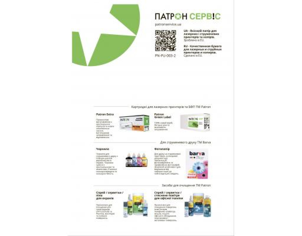| Бумага PATRON A4 OFFICE PAPER (PN-PU-003-2) Многофункциональная бумага Patron формата А4 для каждодневной работы. Используется для печати на всех основных типах оргтехники: копировальных аппаратах, лазерных и струйных принтерах, факсимильных аппаратах. Одинаковое качество поверхности обеих сторон, допускает двустороннюю печать. Обеспечивает хороший результат печати на всех видах офисной техники. ТМ Patron - это известный бренд, зарекомендовавший себя как надёжный поставщик расходных материалов за разумные деньги, что позволяет экономить до 30% бюджета на обслуживании печатающей техники. В ассортименте патрон популярны картриджи и тонеры для лазерных, струйных и матричных принтеров, а также чернила и СМПЧ. Ещё торговая марка Патрон известна своими чистящими средствами для оргтехники. |