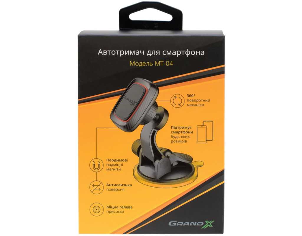 Простой при установке и использовании автомобильный держатель Grand-X подойдет для смартфонов любых размеров. Универсальность крепежа позволяет использовать данный держатель практически в любом автомобиле. В автомобильном держателе Grand-X MT-04 предусмотрена возможность изменения угла наклона самого держателя в широком диапазоне, что позволяет пользователю разместить его максимально удобно. Одним движением руки Вы можете легко изменять положение смартфона с вертикального на горизонтальное и наоборот, а крепкие неодимовые магниты надежно фиксируют смартфон на всех поворотах и неровностях дороги. Клейкая гелевая основа присоски с двойной фиксацией дает дополнительную фиксацию, что способствует максимальной надежности крепления. Удобство использования: одним движением руки вертикальное положение смартфона легко меняется на горизонтальное и наоборот. Так же просто телефон крепится и снимается. Особенности: