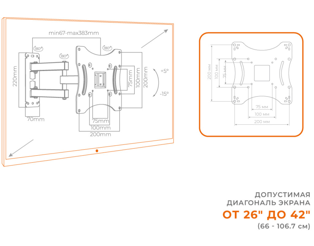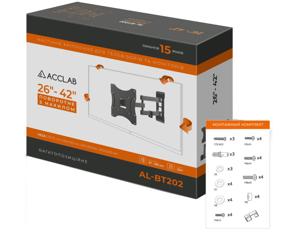 | Кронштейн ACCLAB AL-BT202 (1283126485756) — это надежный и функциональный аксессуар, предназначенный для удобного размещения вашего телевизора или монитора на стене. Этот высококачественный кронштейн поддерживает поворотно-наклонный механизм, который предоставляет вам свободу в выборе лучшего угла просмотра, обеспечивая комфорт и эффективность использования пространства. Одним из ключевых преимуществ этого кронштейна является его способность поддерживать широкий диапазон диагоналей экранов — от 26" до 42". Благодаря универсальным размерам, ACCLAB AL-BT202 совместим с различными моделями телевизоров и мониторов, что делает его легким в использовании и адаптивным решением для вашего дома или офиса. Инженеры ACCLAB разработали кронштейн так, чтобы обеспечить максимальную гибкость размещения: возможность поворота на 90° в обе стороны и регулировка угла наклона от 3° до -12° позволяет легко настроить экран под необходимым углом. Кроме того, расстояние до стены, варьирующееся от 67 до 383 мм, предоставляет возможность выбрать идеальное положение для вашего дисплея. Важной характеристикой этого кронштейна является его прочность и надежность. Изготовленный из высококачественного металла, ACCLAB AL-BT202 выдерживает нагрузку до 25 кг, обеспечивая безопасность и стабильность вашей техники. Удобство установки обеспечивается благодаря наличию в комплекте всего необходимого: крепления для монтажа, органайзеры для кабелей, а также инструкция с понятными и детальными указаниями. Кроме того, в комплект входит специальный уровень, который облегчает точное позиционирование устройства на стене. ACCLAB AL-BT202 поддерживает стандарты VESA (100 x 100, 75 x 75, 200 x 100, 200 x 200), что гарантирует совместимость с большинством современных телевизоров и мониторов. В общем, ACCLAB AL-BT202 — это надежный выбор для тех, кто ценит качество, надежность и удобство. Используя этот кронштейн, вы можете оптимизировать пространство, создать комфортные условия для просмотра и быть уверенными в безопасности вашего оборудования. Выбирая ACCLAB AL-BT202, вы получаете отличный баланс между ценой и качеством, оборудуя свое жилье или рабочее место элегантным и практичным решением. |