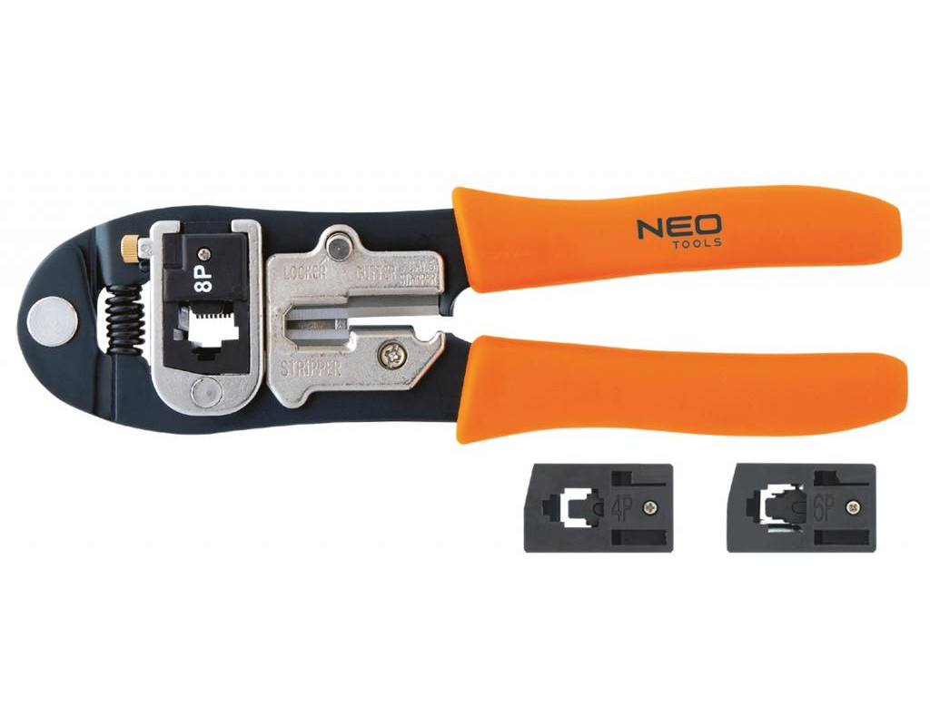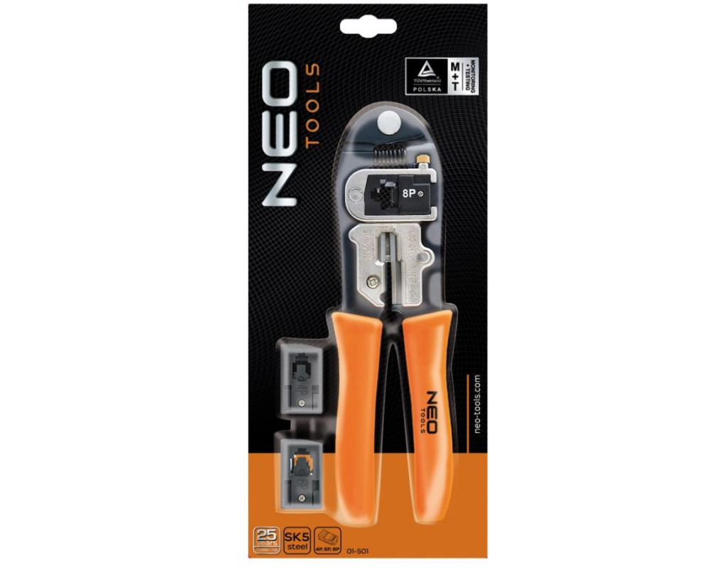| Кліщі для обтискання телефонних наконечників NEO, довжиною 195 мм. Зі змінними головками для обтискання наконечників 4P, 6P, 8P. Ріжучі кромки з міцної сталі SK5 з твердістю 42-48 HRC. Рукоятки з високоякісним гумовим покриттям (TPR) підвищують комфорт роботи. Якість інструменту підтверджено сертифікатом TÜV і 25-річною гарантією виробника. Бренд NEO виправдовує очікування професіоналів. |