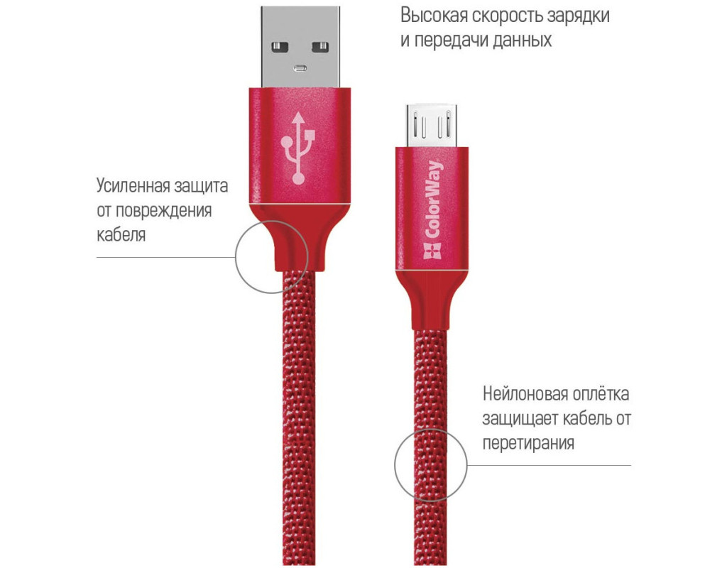 Тип - кабель, Тип коннектора 1 - USB 2.0, Тип коннектора 2 - micro USB, длина - 2 м, Номинальный ток - 2.4 А, нейлоновое покрытие, Цвет - красный