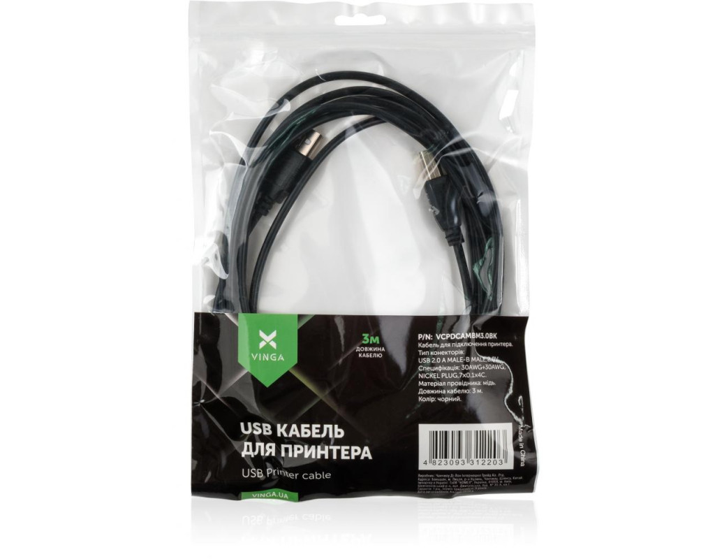 Кабель для принтера USB 2.0 AM/BM 3.0 m Vinga (VCPDCAMBM3.0BK)