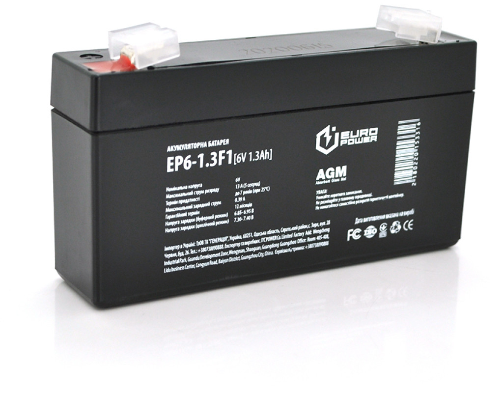 | Акумуляторна батарея EUROPOWER AGM EP6-1.3F1 6 V 1.3 Ah ( 95 x 25 x 50 (55) ) Black Q40 |