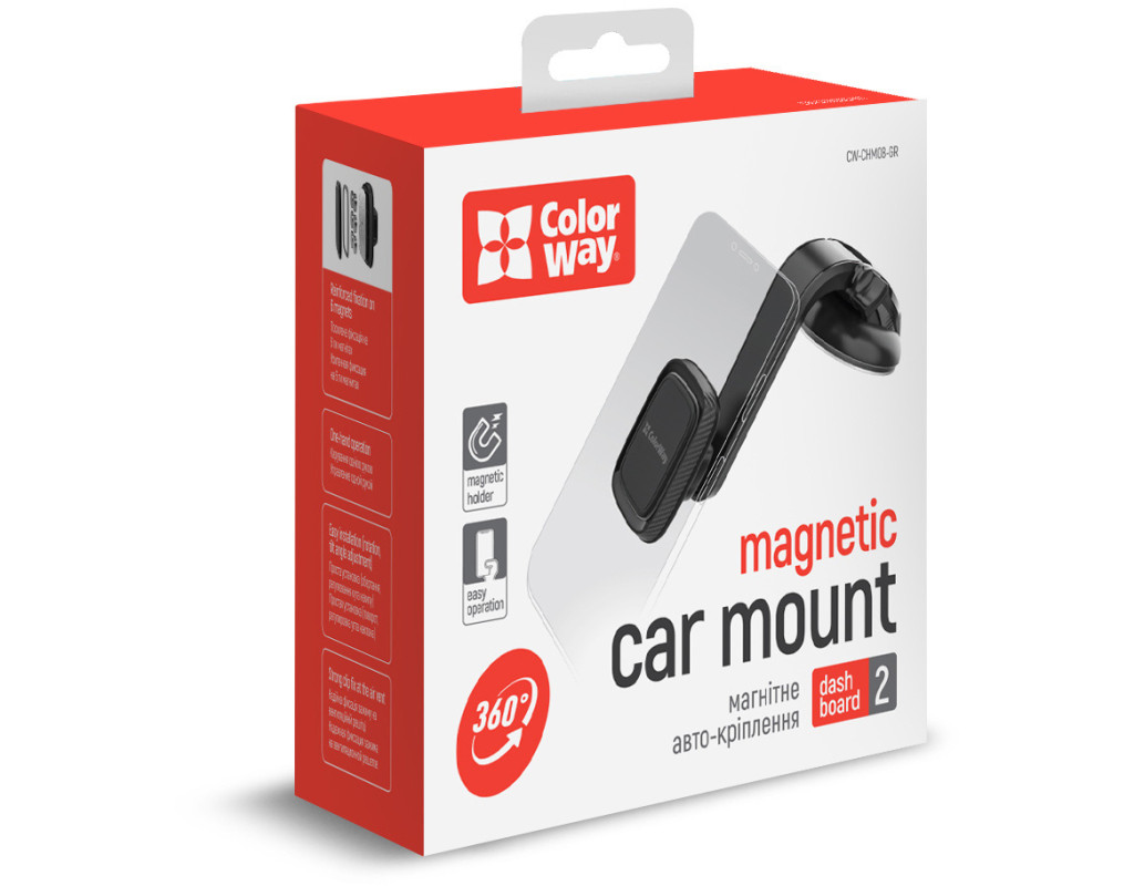 Автодержатель СolorWay для телефона магнитный Dashboard-2 (360° rotation) Gray дизайн которого специально разработан так, чтобы не перекрывать обзор и не отвлекать водителя от дороги. Конструкция в виде мини-дуги, которая идеально повторит приборную панель и обеспечит надежную фиксацию на центральной консоли (торпедо) вашего авто благодаря клейкой присоске. Совместим с устройствами большинства брендов. Кронштейн оборудован удобной крепью, с помощью которой вы сможете закрепить смартфон на панели в любом удобном для вас месте, а функция вращения на 360 градусов позволит установить комфортный угол обзора. Специально не скользящая поверхность подушечек владельца защитит приборную панель от повреждений и царапин. Автомобильный магнитный держатель оснащен мощным неодимовым магнитом, который способен зафиксировать любые современные смартфоны, при этом предотвращая выпадение даже при сильной тряске. Эргономично вписывается в интерьер салона любого автомобиля. Особенности