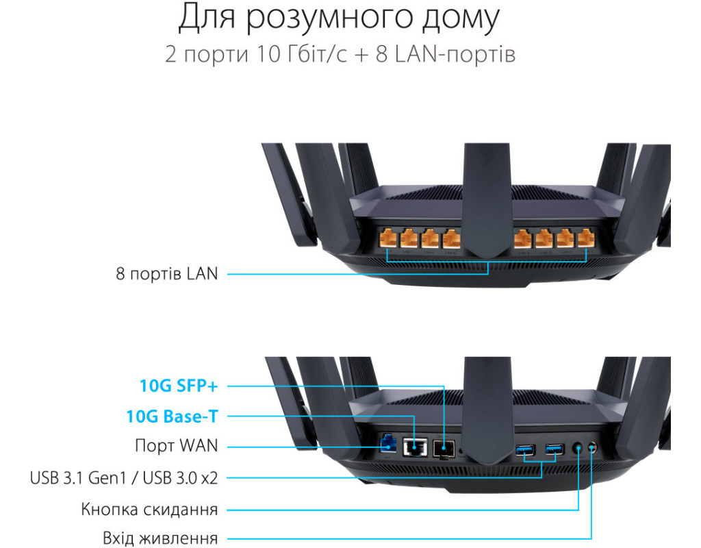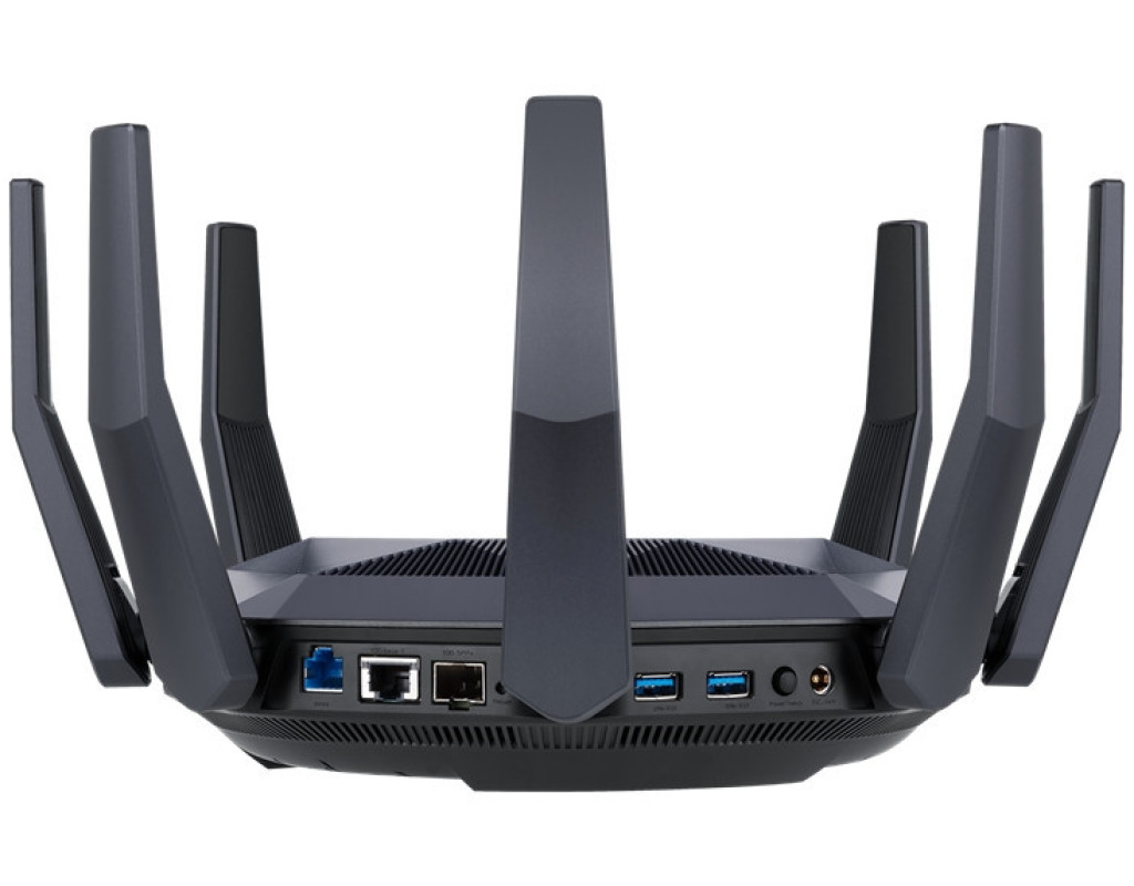 Новый стандарт Wi-Fi для вашего дома По мере увеличения числа подключаемых к интернету устройств возможностей нынешнего стандарта Wi-Fi становится недостаточно. Ориентированные на будущее технологии, воплощенные в новейшем стандарте 802.11ax, улучшают эффективность, скорость работы и покрытие беспроводной сети Wi-Fi, а также помогают уменьшить энергопотребление подключаемых к ней устройств. Его преимущества непременно оценит всякий пользователь. Беспрецедентная скорость RT-AX89X– это двухдиапазонный беспроводной маршрутизатор с антенной конфигурацией 8х8. Используя квадратурную модуляцию 1024-QAM, он способен обеспечить общую скорость передачи данных по сети Wi-Fi на уровне 5952 Мбит/с: 1148 Мбит/с в диапазоне 2.4 ГГц и 4804 Мбит/с в диапазоне 5 ГГц. Таким образом, данная модель в 2.8 раза быстрее, чем двухдиапазонные маршрутизаторы стандарта 802.11ac с антенной конфигурацией 4x4. Большое количество сетевых портов Восемь портов Gigabit Ethernet делают модель RT-AX89X идеальным выбором для тех пользователей, у кого есть несколько устройств с проводным подключением: компьютеры, сетевые накопители и т.д. Высокоскоростное проводное подключение RT-AX89X оборудован двумя портами 10 Gigabit Ethernet (один – Base-T, второй – SFP+), таким образом он поддерживает подключение на скорости до 10 Гбит/с как через оптоволоконный, так и через медный кабель. Это позволяет использовать максимально быстрые каналы подключения к ISP, а также реализовать высокоскоростное подключение ПК к NAS в собственной локальной сети стандарта 10G. Для домашних сетей с высокой загрузкой Революционное сочетание технологий OFDMA и MU-MIMO, реализованных в стандарте Wi-Fi 802.11ax обеспечивает увеличенную пропускную способность и более эффективное ее использование в случае беспроводных сетей с высокой загрузкой. В рамках предыдущей версии Wi-Fi (802.11ac) каждый сетевой канал мог использоваться клиентскими устройствами лишь по очереди. В отличие от этой неэффективной схемы, технология OFDMA, являющаяся частью стандарта Wi-Fi, подразумевает разделение каждого канала на подканалы меньшего размера, что позволяет объединять и передавать одновременно сигналы от множества клиентских устройств, тем самым снижая латентность при обмене данными по сети Wi-Fi. Информационная защита корпоративного класса для домашних сетей RT-AX89X включает в себя систему информационной безопасности AiProtection Pro на базе разработок компании Trend Micro, которая обеспечивает защиту от интернет-угроз для всех подключенных к нему цифровых устройств. С помощью функции родительского контроля можно указать расписание доступа в интернет. Также имеется возможность полностью заблокировать нежелательные веб-сайты и мобильные приложения. Стабильное беспроводное подключение Прокладывать кабель в дальний уголок дома бывает не особенно удобно, поэтому приходится пользоваться беспроводным соединением. Антенны специальной конструкции в RT-AX89X обеспечивают стабильное высокоскоростное подключение по сети Wi-Fi, которое позволит с комфортом играть в игры или заниматься серьезной работой. Мощный четырехъядерный процессор RT-AX89X оснащается мощным 64-битным четырехъядерным процессором с частотой 2.2 ГГц, производительности которого хватит для любых задач. Он выполняет обработку сетевых пакетов, передачу данных по интерфейсу USB и все остальные задачи на невероятно высокой скорости. Беспр