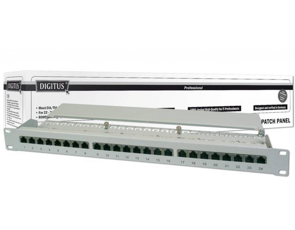 Патч-панель 19" 1U 24 порта 5e FTP в сборе DIGITUS (DN-91524S) имеет 24 порта для подключения отдельных элементов сети друг к другу. Подключение осуществляется коммутационными шнурами. - соответствие стандартам ISO/IEC 11801 и EN 50173 - Установка кабелей посредством планок с зажимами LSA, цветовая кодировка основана на стандартах EIA/TIA 568 A&B - Подходит для установки в шкаф 483мм (19`) - Материал корпуса: SECC, 1,5 мм гальванизированный, стальной холоднокатаный EN1.4301, UNS S30400, AISI 304 и LMSAD110 - Категория: CAT 5e - Порты: 24 гнезда RJ45.