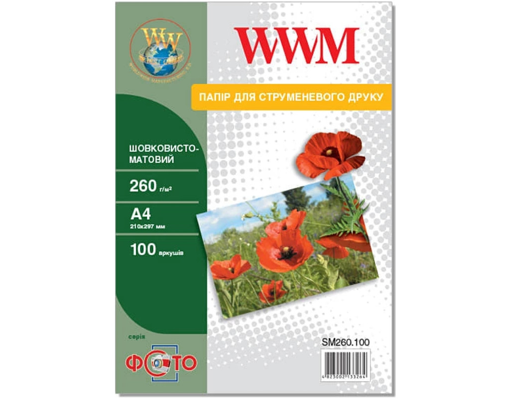 | WWM A4 (SM260.A4.100) - шелковисто матовая односторонняя фотобумага средней плотности для печати на принтерах, использующих водорастворимые и пигментные чернила. Матовое покрытие бумаги WWM A4 (SM260.A4.100) при сильном увеличении имеет вид гористого рельефа. Поэтому отраженный свет рассеивается под разными углами. Изображение, отпечатанное на матовой бумаге, не бликует, линии высококонтрастны, чистые тона имеют характерную бархатистую глубину. |
