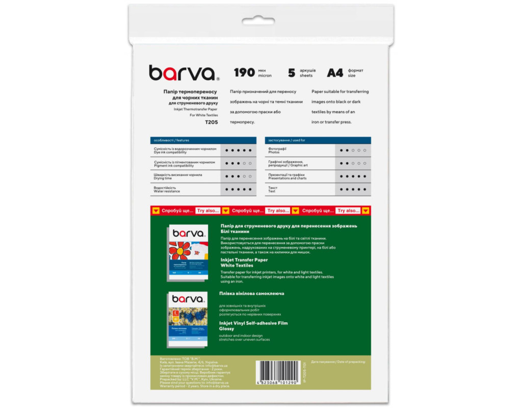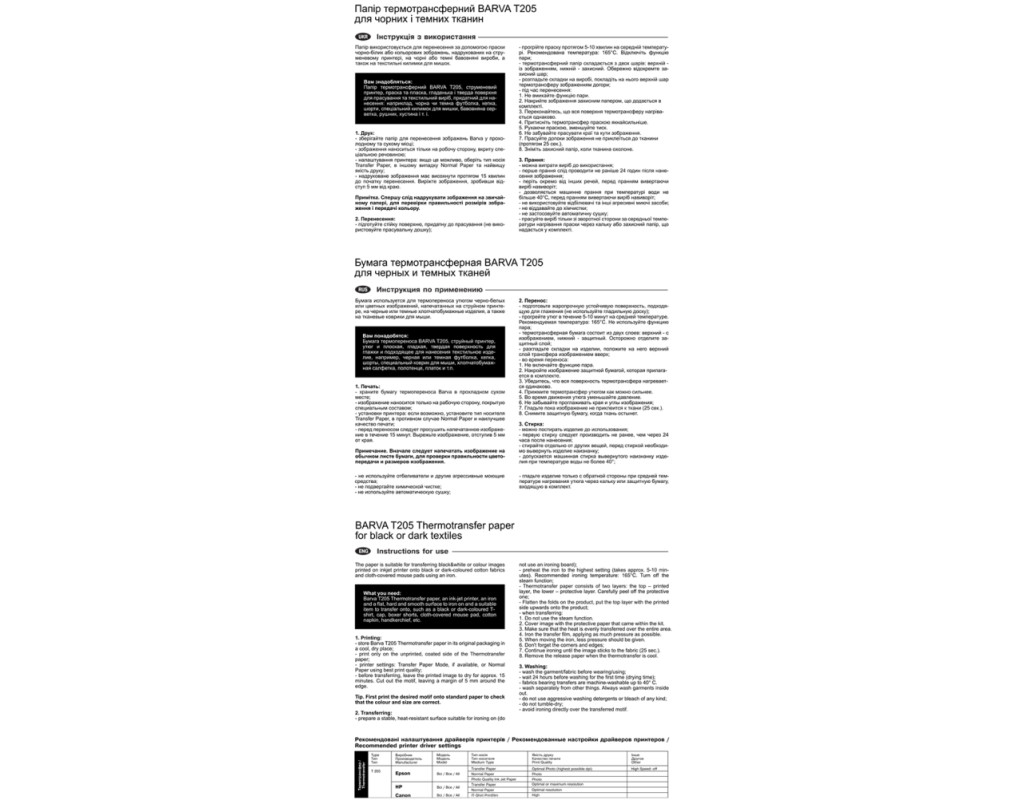 | Бумага BARVA A4 THERMOTRANSFER Black (IP-BAR-T205-T01) Специальная бумага, предназначенная для перенесения на ткань изображений, полученных на струйном принтере. Имея такую бумагу, можно при помощи обычного утюга перенести понравившееся изображение на футболку, шорты, салфетки, флажки и другие подобные предметы. Термотрансферная бумага BARVA производится в трех модификациях: • для белых тканей; • для черных тканей; • для белых тканей с блеском. |
