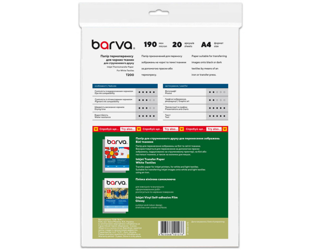 | Бумага BARVA A4 THERMOTRANSFER Black (IP-BAR-T205-075) Специальная бумага, предназначенная для перенесения на ткань изображений, полученных на струйном принтере. Имея такую бумагу, можно при помощи обычного утюга перенести понравившееся изображение на футболку, шорты, салфетки, флажки и другие подобные предметы. |