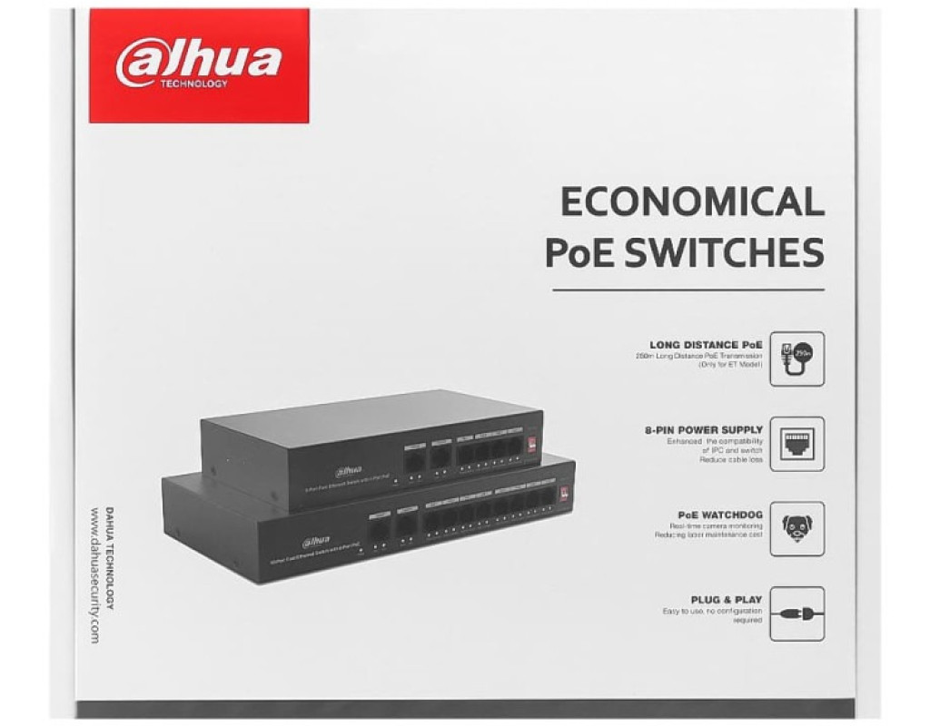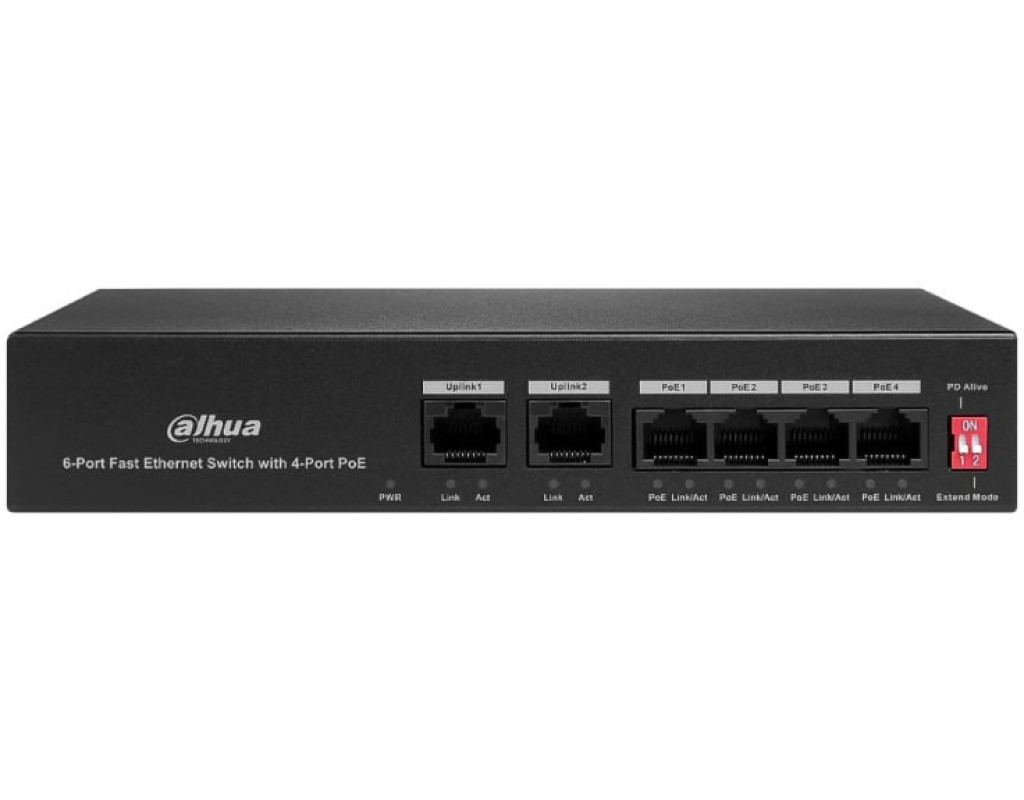 | DH-PFS3006-4ET-36, 4-портовый коммутатор поддерживает передачу данных и питания PoE на 250 метров. Оснащен четырьмя Downlink портами PoE 10 / 100 Мбит/с и двумя Uplink портами 100 Мбит/с. Устройство поддерживает два режима передачи данных (по умолчанию / CCTV), которые управляются с помощью DIP-переключателя. |