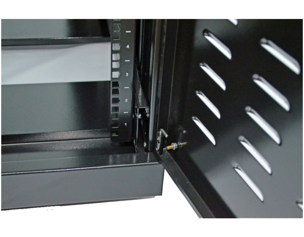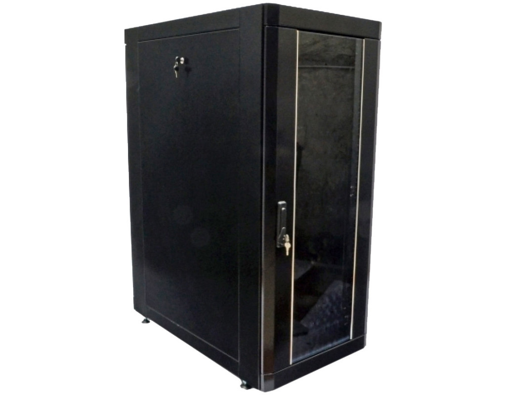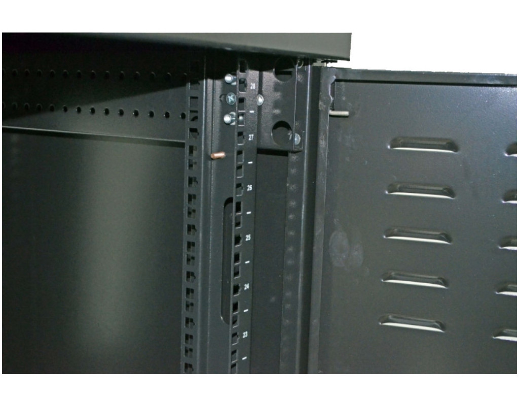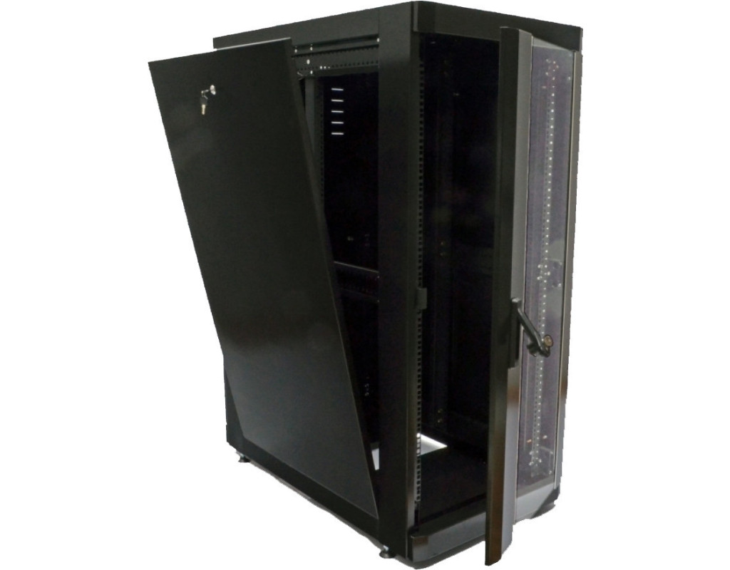 Серверный шкаф 19" 33U серии MGSE с передней дверью из каленого стекла и задней глухой дверью, предназначен для организации коммутационного узла в офисных и серверных помещениях. Благодаря двум парам направляющих с лицевой и задней стороны и допустимой нагрузке в 500 кг, в шкафах есть возможность размещения оборудования на четыре точки крепления, такого как серверы, блок бесперебойного питания повышенной емкости и полки глубиной более 450 мм. Двусторонняя конструкция позволяет как устанавливать оборудование с двух сторон, что увеличивает высоту в юнитах в два раза, так и масштабировать сеть в будущем, например, в настенный шкаф на 18U можно установить только 18 патч-панелей, в напольный шкаф 18U устанавливается уже 36 панелей. Глубина коммутационного шкафа выбирается, исходя из глубины серверного оборудования, которое нужно в нем разместить. Доступно три варианта: 675 мм, 865 мм и 1055 мм. Глубина должна быть не меньше глубины сервера + 140 мм (на 70 мм выступает шнур питания, 70 мм надо оставить перед передним стеклом). Несмотря на то, что 19" направляющие можно зафиксировать вплотную к передней или задней двери, надо оставлять место для соединительных шнуров и кабельных организаторов. В связи с тем, что коммутационный шкаф имеет большой вес и не всегда есть возможность собранную конструкцию занести узкими коридорами или через узкий дверной проем в серверную, он поставляется в разобранном виде в 3-4-х пакетах, каждый из которых способен поднять 1 человек. Шкаф состоит из максимально симметричных деталей, чтобы упростить процесс монтажа. Собирая его, монтажник не думает над тем верх это или низ, правая деталь или левая. Исключение - это промаркированные 19" направляющие и крепления передних и задних дверей. Благодаря массовому применению клепальных гаек и нарезанной резьбы, шкаф способен собрать 1 человек (нет соединений, где нужна третья рука). Точность позиционирования элементов крепления позволяет дотягивать каждый винт сразу до конца, что избавляет от необходимости что-то подравнивать или регулировать и делать конечную дотяжку. Охлаждение серверного шкафа можно реализовать, установив вентиляционный блок из 3-х вентиляторов SUNNON (заказывается отдельно), монтируемый вместо заглушки. Каждую заглушку можно заменить вентиляторным блоком. Вентиляторные блоки можно соединить между собой шнуром С13-С14 (компьютер-монитор). Каждый вентиляторный блок можно подключить к своему термостату и организовать каскадное включение вентиляторных блоков в зависимости от температуры. Питание вентиляторного блока подключается шнуром CEE7-C13 (обычный шнур питания компьютера). В комплекте шкафа MGSE на 1 заглушку меньше. Поэтому в шкаф заводят электрические и коммутационные кабели через не заглушенное отверстие или заказывают кабельный ввод со щетками, монтируемый вместо заглушки. Конструкция имеет 8 приваренных гаек для монтажа ножек, расположенных в углах вертикального элемента каркаса, что позволяет установить коммутационный шкаф к серверной и отрегулировать горизонтальное положение. 8 креплений необходимо для того, чтобы можно было поставить шкафы вплотную (у одного ножки ставятся по краям, у второго - ближе к середине). 4 ножки входят в комплект. Для монтажа колес необходимо самостоятельно сделать отверстия в элементе каркаса.