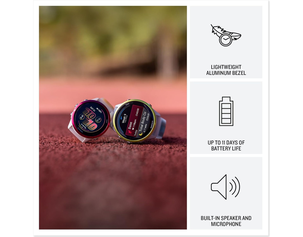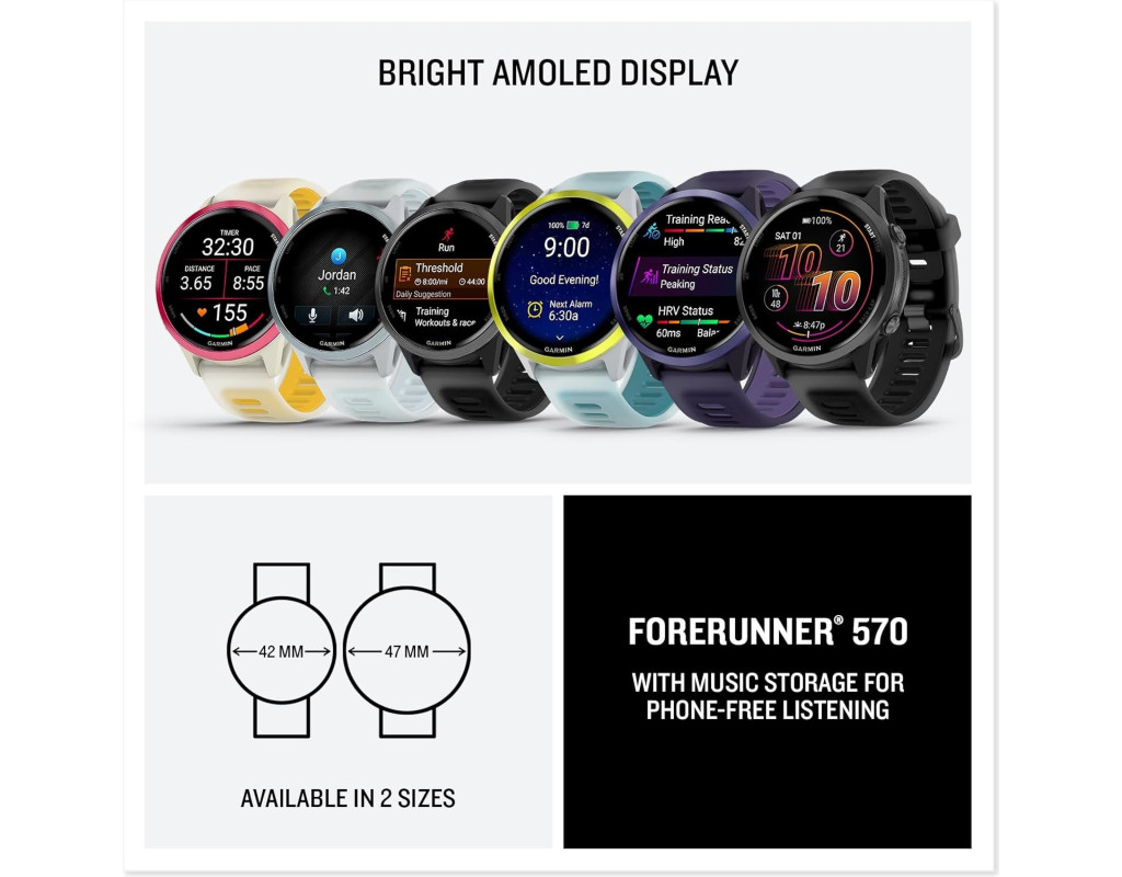 Предназначены для спортсменов, стремящихся к высоким результатам С новыми беговыми смарт-часами Garmin Forerunner 570, которые предлагают расширенный функционал для тренировок и восстановления, а также персонализированные планы тренировок Garmin Coach для бега и триатлона, ваши занятия спортом станут более продуктивными. Выглядят красиво, работают отлично! Благодаря яркому AMOLED-дисплею, легкому алюминиевому безелю и разнообразной цветовой палитре в дизайне эти часы привлекают к себе внимание, смотрятся креативно, но при этом удобны как на тренировках, так и в повседневном ношении. Компания Garmin предоставляет выбор потребителю, предлагая два размера смарт-часов: 42 мм и 47 мм. Автономность Forerunner 570 – до 10/11 дней при обычном использовании в режиме умных часов. «Немного занят. Что случилось?» Знакома вам такая ситуация, когда отвлекают от тренировки телефонными звонками? А у вас нет возможности прервать активность или просто неудобно взять в потные руки телефон? Если да, то умные часы Forerunner 570 вас порадуют тем, что в их корпус интегрированы динамик и микрофон, с помощью которых можно принимать звонки во время пробежки прямо на запястье. Яркий 1,2-дюймовый AMOLED-дисплей До 18 часов работы батареи в режиме GPS Расширенные функции для тренировок и восстановления Технология SatIQ и многодиапазонный GPS Легкий алюминиевый безель Музыка на вашем запястье Что вам понравится Адаптивные планы тренировок Garmin Coach Подготовьтесь к следующему забегу, тренируйтесь для достижения важного результата или просто улучшите свою физическую форму с помощью планов тренировок Garmin Coach для бега, триатлона, велоспорта или силовых тренировок. Выберите нужный план, и он будет ежедневно адаптироваться для персонализированных тренировок на основе показателей вашей производительности, восстановления и здоровья. Готовность к тренировкам С момента пробуждения вы получаете оценку готовности, основанную на данных о качестве сна, восстановлении, тренировочной нагрузке и других параметрах, чтобы вы могли определить, для чего подходит сегодняшний день – для интенсивной нагрузки или для расслабления. Статус тренировки Используя такие показатели, как статус вариабельности сердечного ритма, история последних тренировок и максимальный уровень потребления кислорода (VO2), вы легко сможете оценить эффективность тренировок и узнать, тренируетесь ли вы продуктивно, находитесь ли на пике формы или испытываете перенапряжение Вечерний отчет Чтобы лучше подготовиться к следующему дню, перед сном вы получите вечерний отчет с напоминаниями о потребности во сне, завтрашней тренировке, погоде и намеченных событиях. Ежедневные рекомендуемые тренировки Получайте рекомендации по тренировкам, разработанные специально для вас и на основе ваших данных. Эти рекомендации отличаются по интенсивности и адаптируются после каждой тренировки с учетом производительности и восстановления. Встроенные динамик и микрофон Совершайте и принимайте телефонные звонки с часов, когда они сопряжены со смартфоном. Кроме того, управляйте функциями часов с помощью голосовых команд или используйте голосового помощника смартфона, чтобы отвечать на текстовые сообщения и многое другое. Соединение Музыка Загружайте песни и плейлисты из своих аккаунтов Spotify, Deezer или Amazon Music для прослушивания без телефона. Функции бе