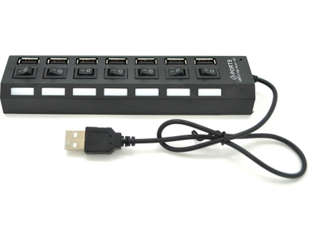 Хаб USB 2.0 универсален Количество разъемов (портов) USB2.0: 7 шт Скорость портов: до 480 Мбит/с Питание от USB порта Выключатель питания хаба на каждый порт Подсветка LED портов: голубая Поддержка операционных систем: 98/ME/Vista/2000/XP/7/8/10/Linux/Mac OS8.6 Поддержка объема памяти до 500 Гбайт Тип материала: пластик Цвет: черный Тип упаковки: Блистер