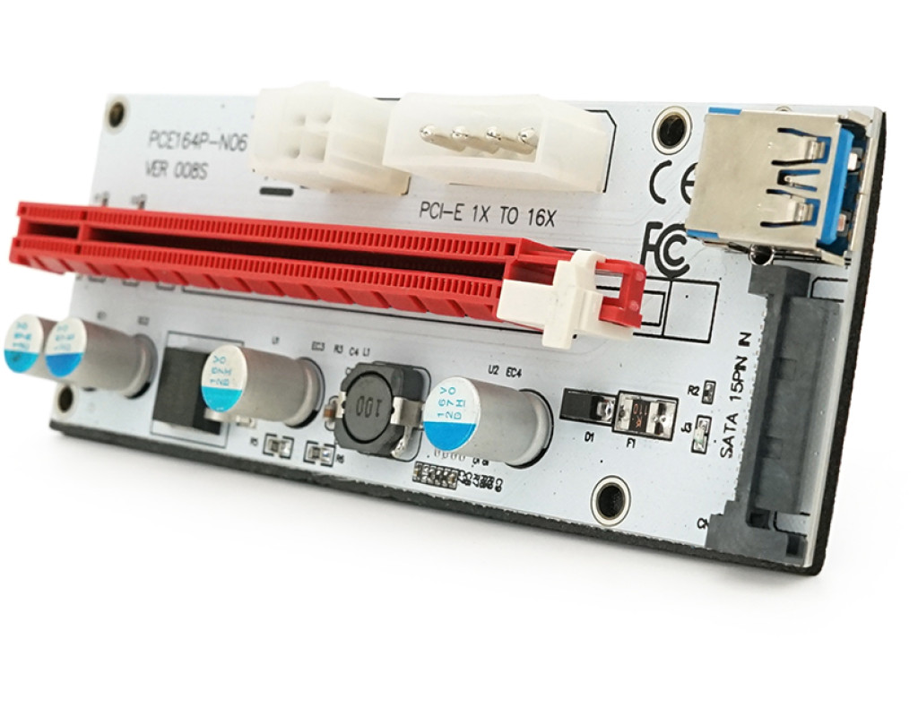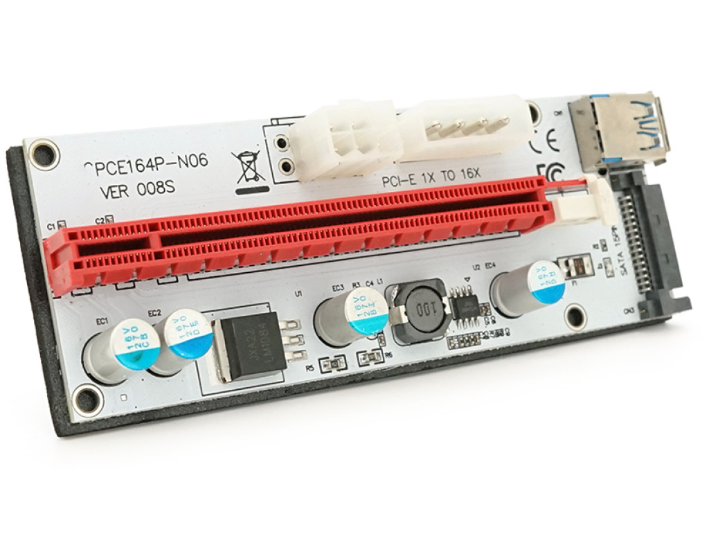 Плата PCE164P-N09 (V008S-Plus) Riser PCI-EX, x1=>x16, USB 3.0, DC12V(Molex&PCI-E / 6pin), SATA / 15pin, конденсатори 270, VER008S,Пакет
