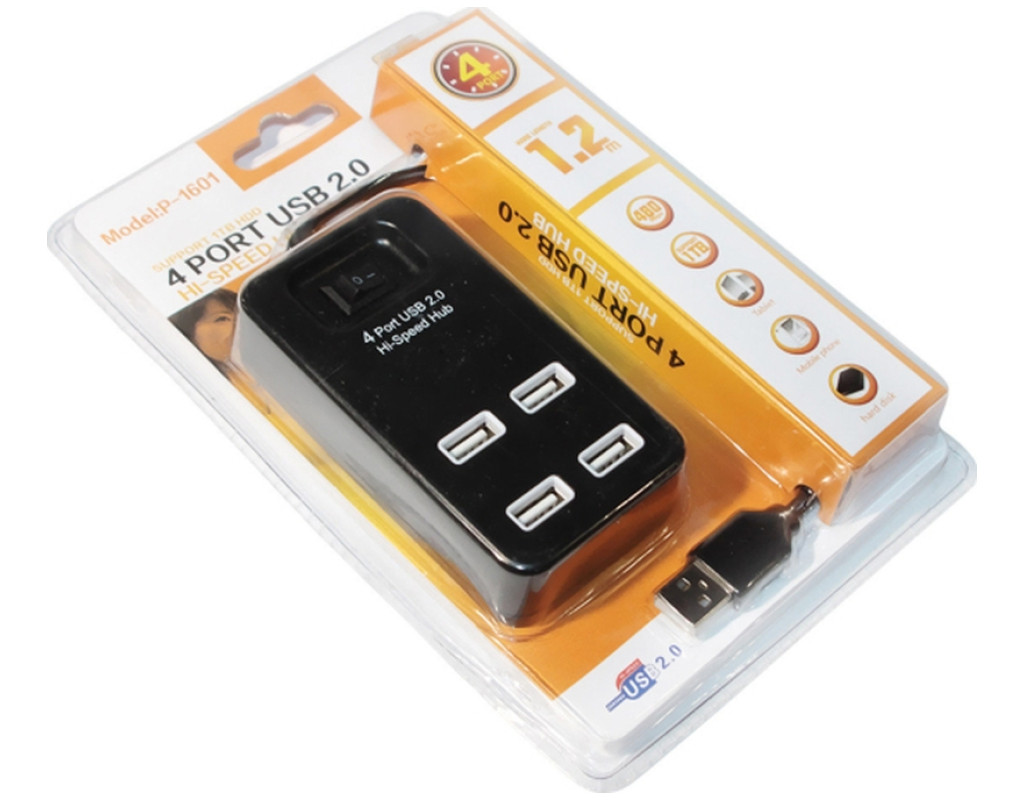 Технические характеристики:Хаб USB 2.0 универсаленКоличество разъемов (портов) USB2.0: 4штСкорость портов: до 480 Мбит/сПитание от USB портаВыключатель питания хабаТип материала: пластикЦвет: черныйТип упаковки: Блистер