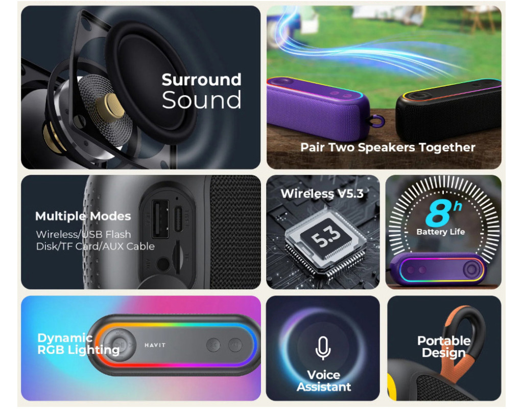 | Акустическая система Havit HV-SK810BT RGB Black (HV-SK810BT) – это отличный выбор для тех, кто ценит мощный звук и стильный дизайн. Благодаря мощности 12 Вт и поддержке Bluetooth 5.3, эта портативная колонка позволяет наслаждаться качественным звуком без ограничений. Её подвесная установка делает размещение удобным и практичным для любого помещения или уличной локации. Эта модель имеет классификацию защиты IPX5, так что вы можете смело использовать её даже под дождём, что делает эту колонку надёжным компаньоном в любых условиях. Питание от аккумулятора обеспечивает до 8 часов непрерывного воспроизведения, что идеально для длительных поездок или вечеринок. Интерфейсы на колонке впечатляют своей универсальностью: USB-C, Micro SD и AUX позволяют быстро подключаться к различным цифровым носителям и гаджетам. Эти интерфейсы, вместе с возможностью подключать две системы в режиме TWS, обеспечивают вам возможность создавать комплексный аудио-опыт. С помощью 1/4" разъёма колонку можно интегрировать в любую композицию с другими аудио-устройствами. Для удобства использования колонка оснащена тактильными регуляторами, которые позволяют легко управлять громкостью и воспроизведением музыки. Встроенное FM-радио добавляет вам свободу выбора источников музыки. Отличным дополнением является наличие функции вызова голосового помощника, что упрощает управление устройствами. Дополнительную атмосферу вечерам создаёт RGB подсветка, которую можно изменять по своему желанию и настроению. Эта функция не только добавляет стильности, но и делает любое мероприятие более ярким и незабываемым. С Havit HV-SK810BT вы получаете больше, чем просто колонку – это ваш новый уровень звуковых возможностей, которые восхищают своей качеством и многофункциональностью. Наслаждайтесь каждым тактом музыки, не уступайте стилем и технологическими преимуществами с этой уникальной акустической системой. |