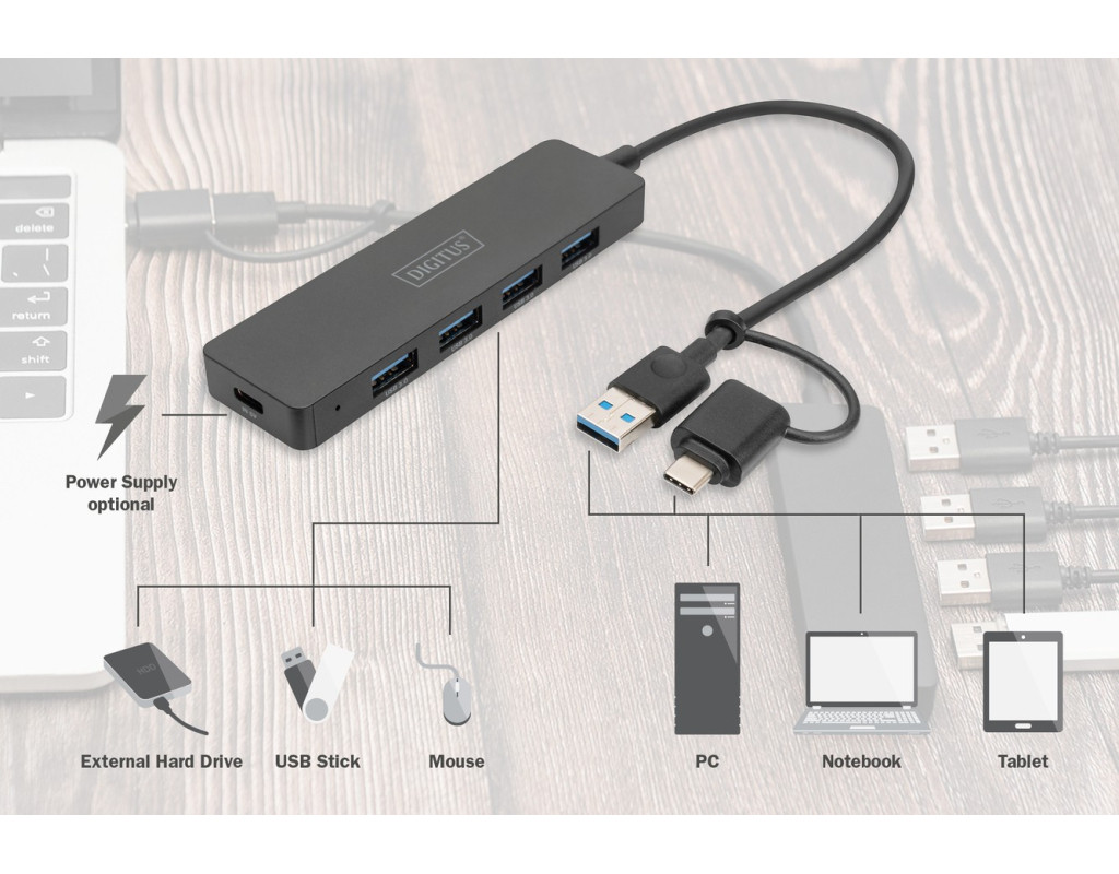| Компактный 4-портовый USB 3.0 концентратор DIGITUS Slim Line с 0,2 м кабелем обеспечивает быструю передачу данных до 5 Гбит/с. Поддерживает одновременное подключение нескольких устройств, имеет обратную совместимость с USB 2.0 и 1.1. Подходит для использования дома, в офисе и путешествиях. |