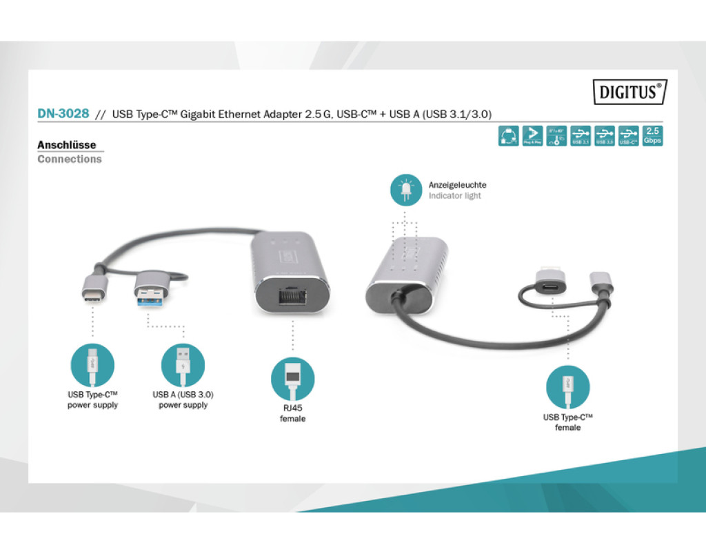 | Расширьте свой ноутбук с помощью подключения USB-C ™ / USB A, чтобы включить мультигигабитное сетевое подключение (RJ45) со скоростью до 2,5 Гбит / с. С помощью адаптера USB Type-C ™ Gigabit Ethernet вы можете добавить сетевое подключение к ноутбуку или настольному ПК и достичь скорости до 2,5 Гбит / с. Подключи и работай - просто подключи и приступай. Питание удобно осуществляется через интерфейс USB-C ™. Кроме того, входящий в комплект поставки USB A позволяет использовать его со старыми USB-разъемами, имеющими обратную совместимость с USB 3.0 и ниже. |