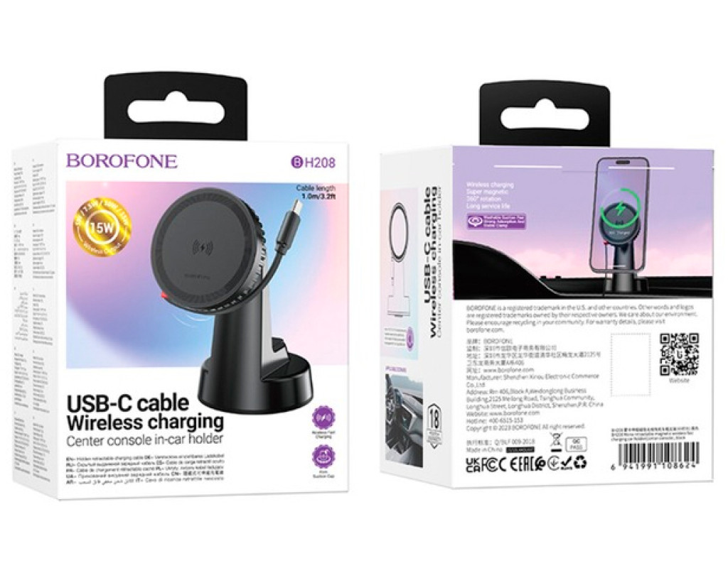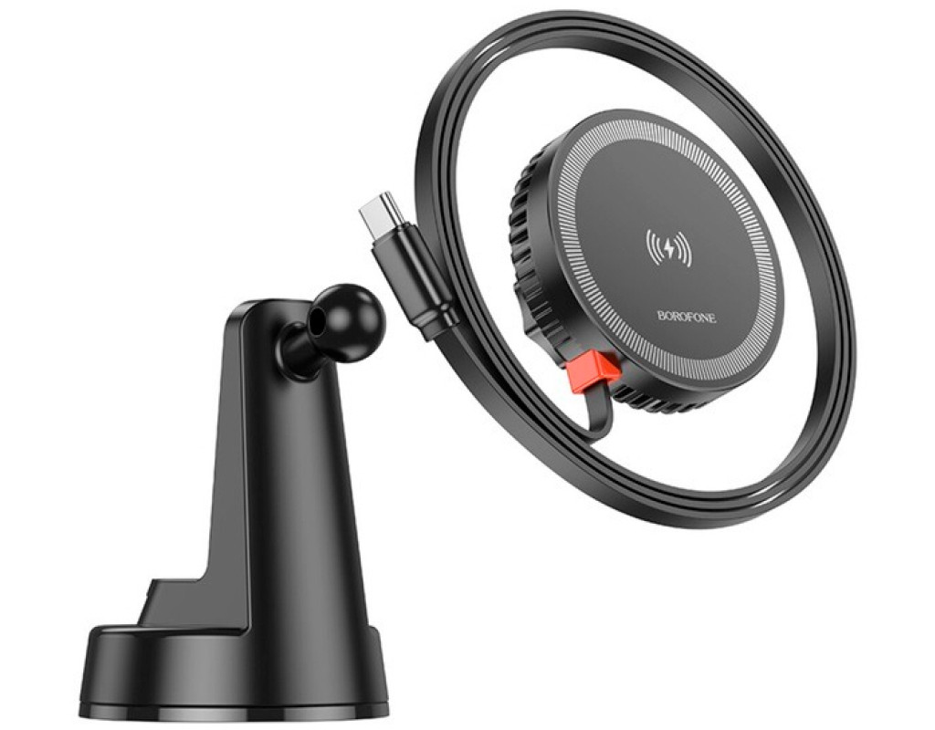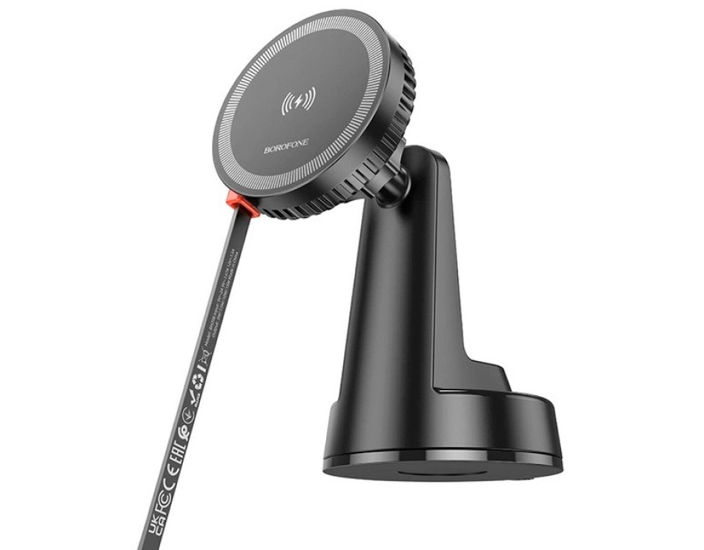 Автотримач BOROFONE BH208 + Wireless Charging 15W, кріплення на торпеду, клямка 50-90мм, Black, Box