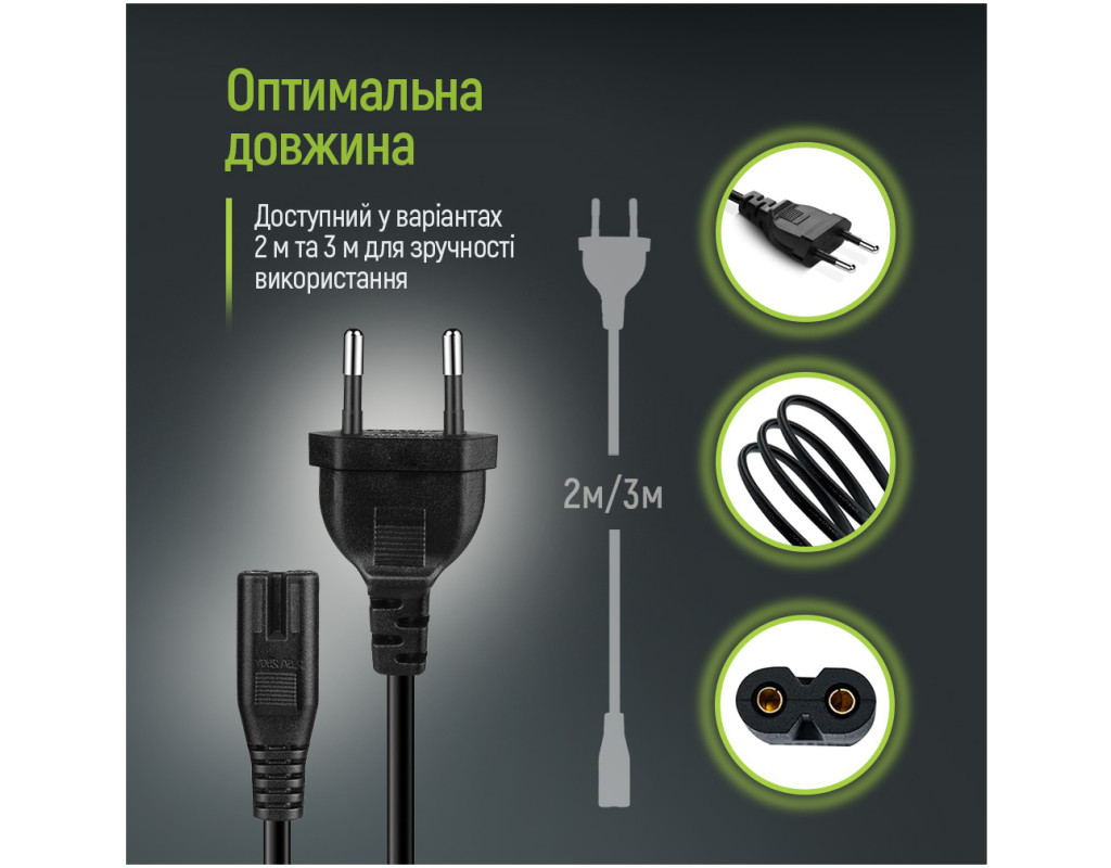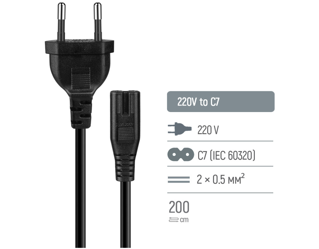 Кабель питания ColorWay C7 – компактное решение для подключения техники с двухконтактным разъемом C7 (IEC 60320) к электросети. Идеально подходит для ноутбуков, игровых приставок, зарядных станций, аудио- и видеотехники, а также других устройств, не требующих заземления. Прочная ПВХ оболочка обеспечивает защиту кабеля от повреждений и износа, а проводник с сечением 2×0.5 мм² гарантирует стабильную и безопасную подачу электроэнергии. Доступный в длинах 2 и 3 метра для комфортного использования в любой среде. Особенности: