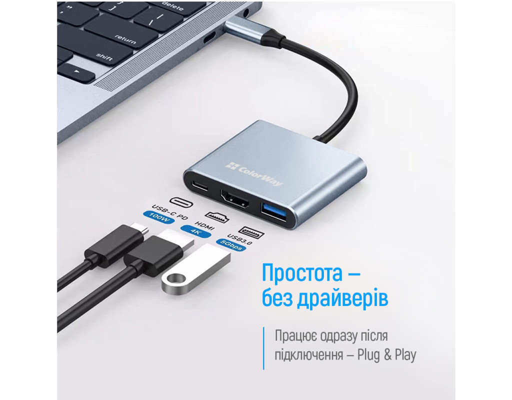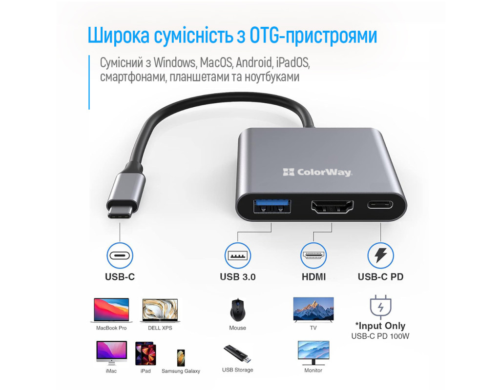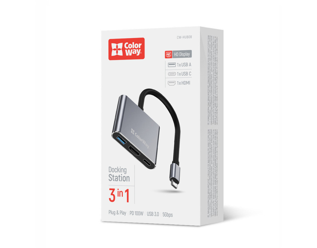 USB Хаб (Док-станция) ColorWay 3-в-1 USB-C PD 100W/USB 3.0/HDMI 4K - Компактная и функциональная док-станция ColorWay 3-в-1 предназначена для расширения возможностей вашего ноутбука, ПК, смартфона или планшета с поддержкой OTG. Она позволяет одновременно заряжать устройства, передавать данные и отображать видео в формате 4K через один USB-C порт. Особенности :
