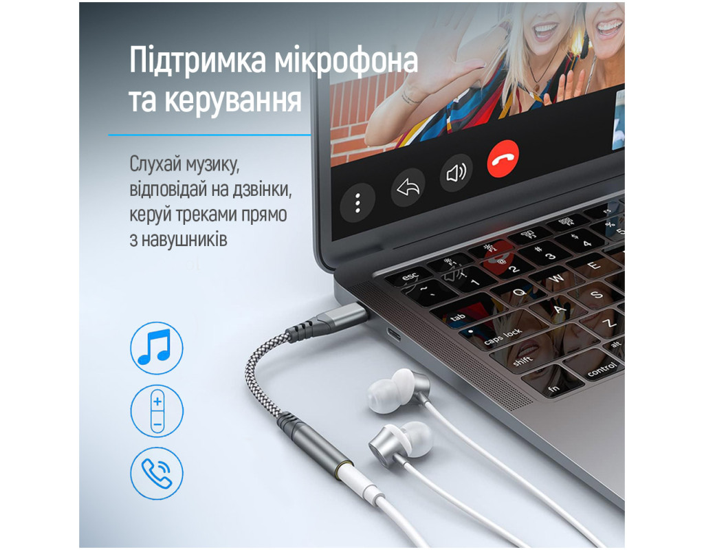 • Легко использовать: достаточно подключить кабель 3.5 мм к адаптеру, а адаптер — к порту Type-C.