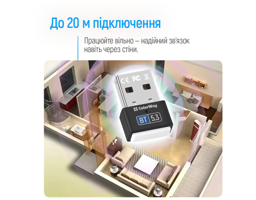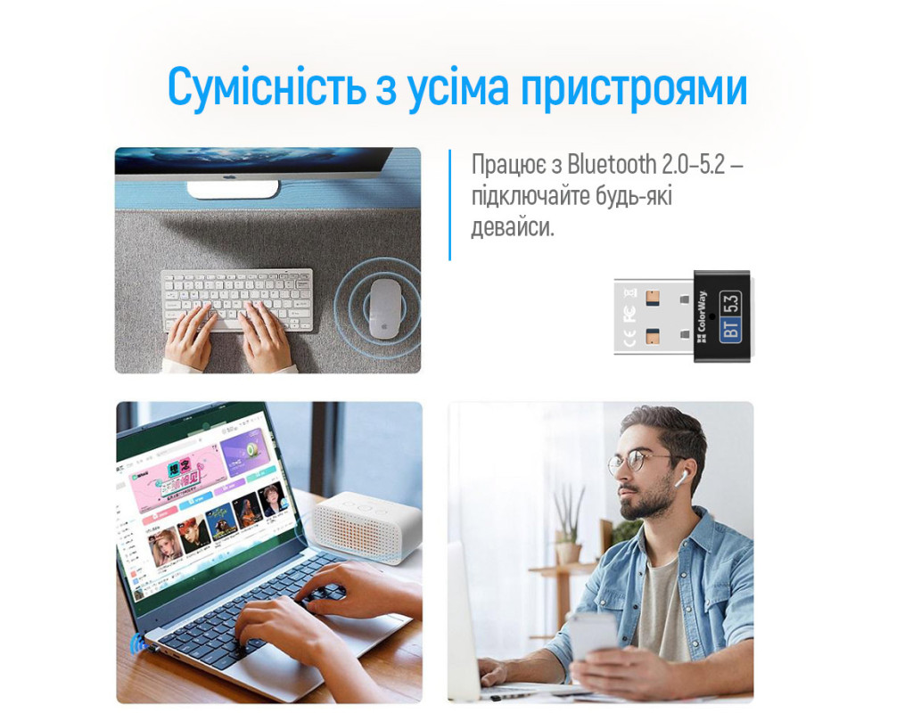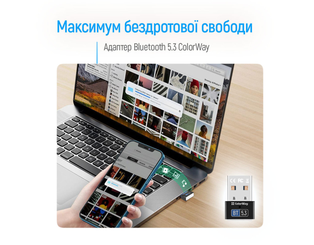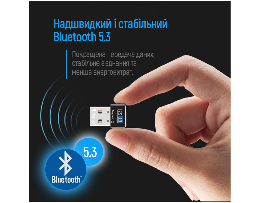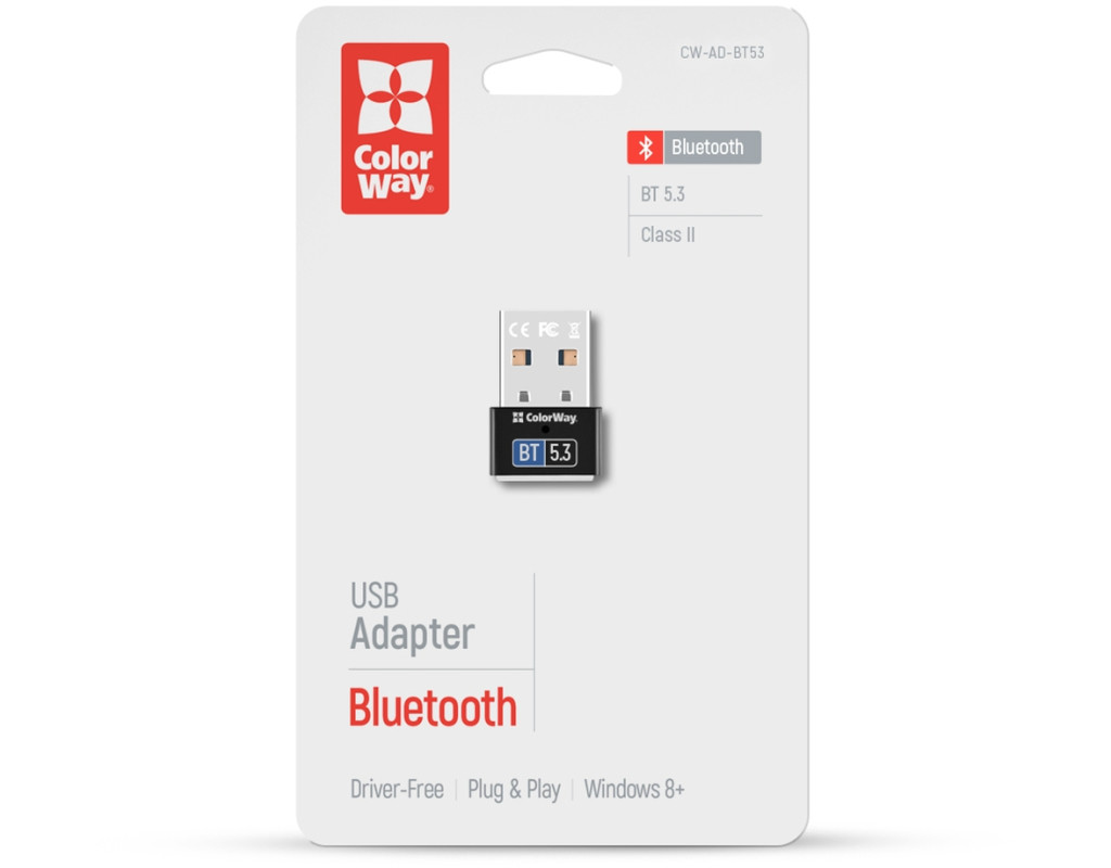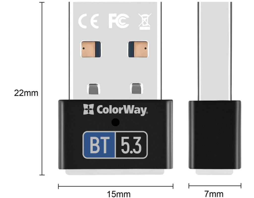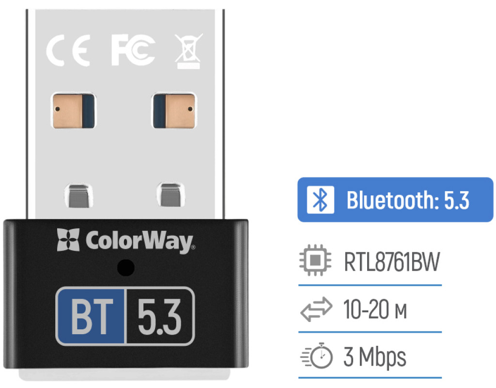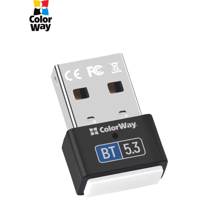 Адаптер ColorWay Bluetooth 5.3 USB – Расширьте возможности подключения вашего компьютера или ноутбука с новым адаптером ColorWay Bluetooth 5.3. Подключайте беспроводные наушники, колонки, клавиатуры, мыши и другие устройства Bluetooth легко и быстро.